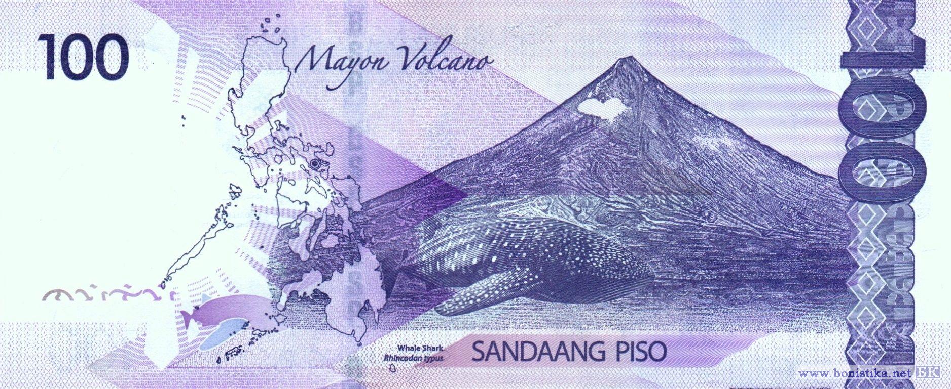 Фрагмент фасада старого здания Центрального банка в городе Манила, легковой автомобиль, юрист, министр финансов, президент Мануэль Рохас и Акунья, сцена провозглашения Третьей республики 4 июля 1946 года, новая эмблема Центрального банка. Карта Филиппин, стратовулкан Майон в национальном парке «Вулкан Майон» в регионе Биколь на острове Лусон, китовые акулы (Rhincodon typus) – пелагические акулы семейства ринкодонтовых, крупнейшие из современных рыб, фрагмент дизайна текстиля Бикольского региона.