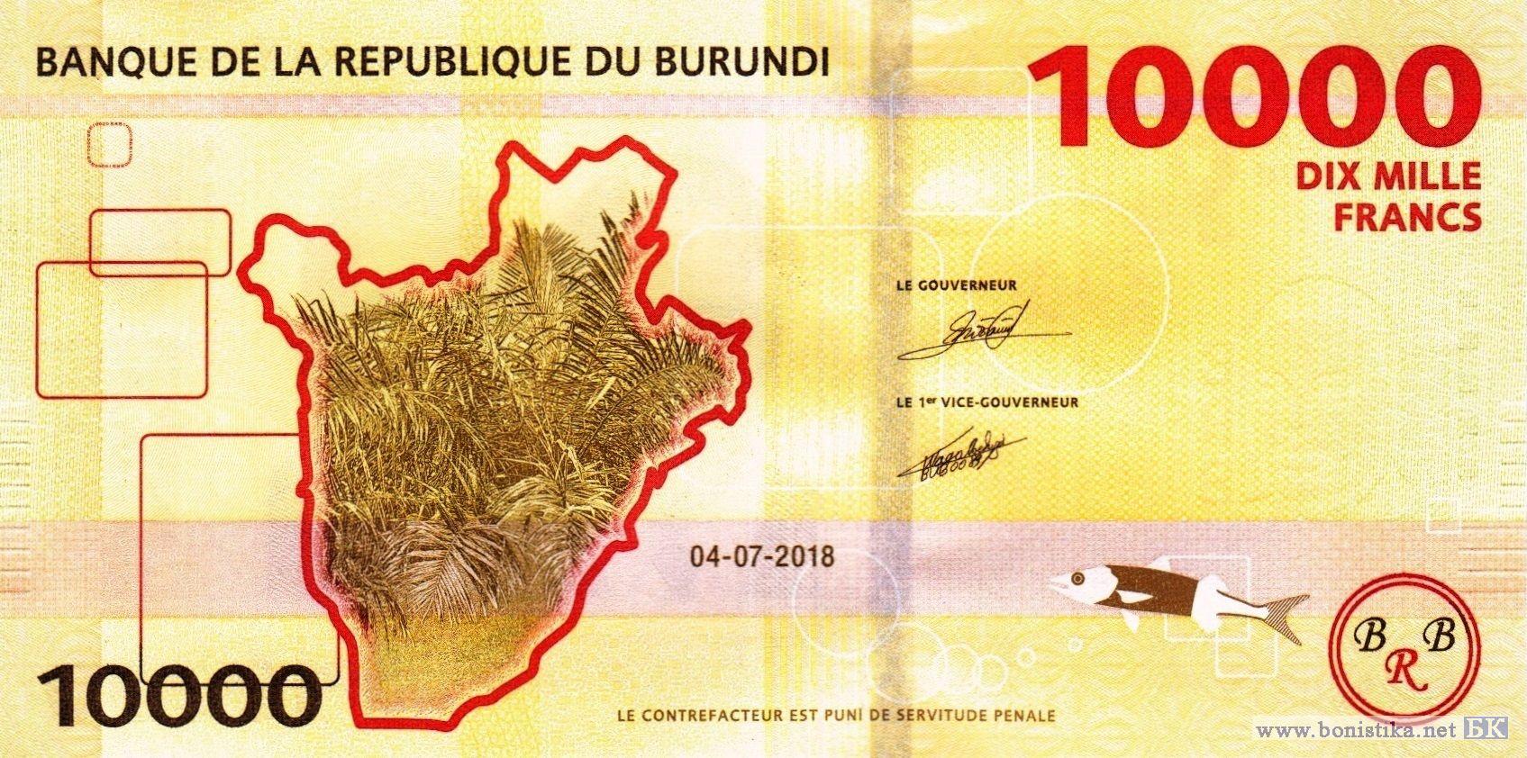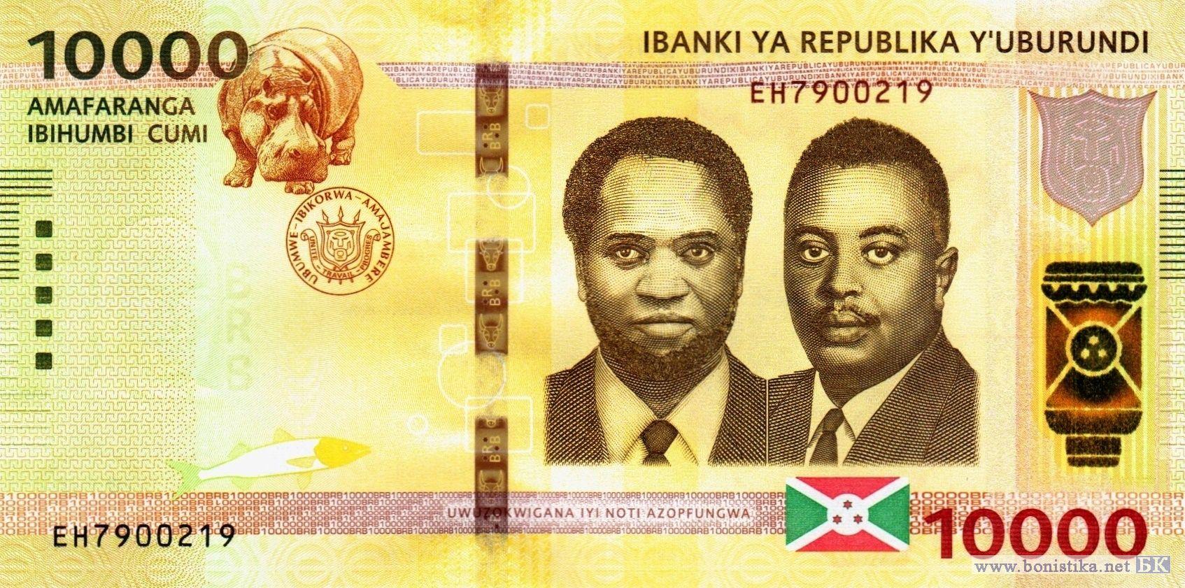 Обыкновенный бегемот, или гиппопотам (Hippopotamus amphibius) – парнокопытное млекопитающее семейства бегемотовых, эмблема Банка Республики Бурунди, рыба, президент Мельхиор Нгези Ндадайе, был похищен и убит во время военного переворота 1993 года, национальный герой, политический деятель, премьер-министр, принц Луи Рвагасоре, флаг Бурунди. Стилизованное изображение очертания территории Бурунди, ветви с листьями пальмы, рыба, монограмма Банка Республики Бурунди.