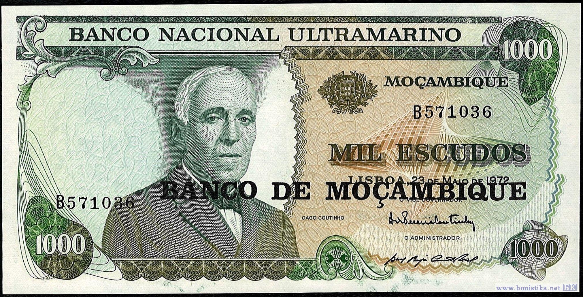 надпечатка на лицевой стороне чёрным шрифтом BANCO DE MOÇAMBIQUE от 1976 года.
