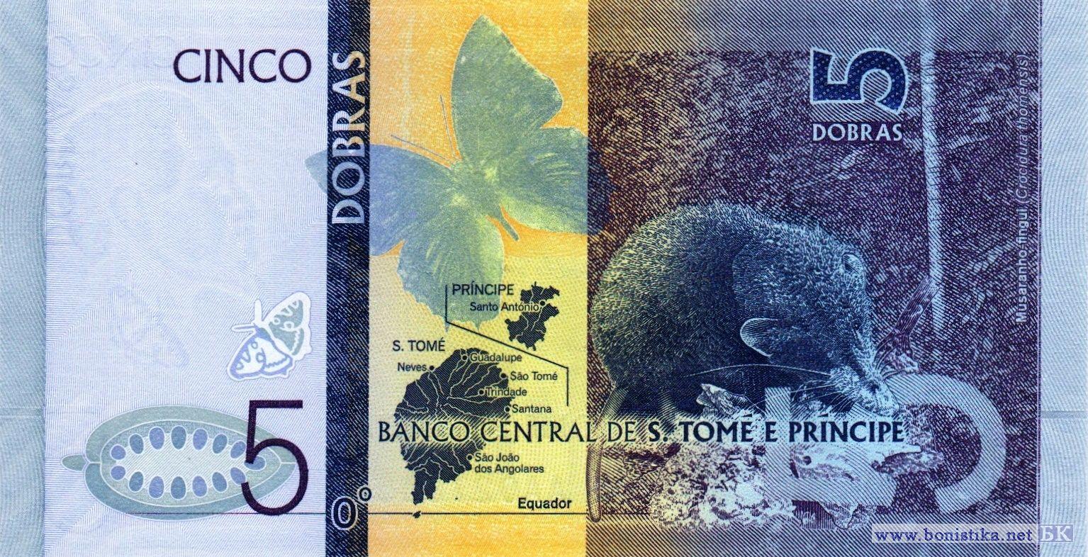 Бабочка акрея инсулярис (Acraea insularis) – чешуекрылое насекомое семейства нимфалид, здание Центрального банка в городе Сан-Томе. Продольный разрез плода какао, или шоколадного дерева (Theobroma cacao) – вечнозеленого дерева семейства мальвовых, бабочки, карта Сан-Томе и Принсипи, сан-томская белозубка (Crocidura thomensis) – насекомоядное млекопитающее семейства землеройковых.
