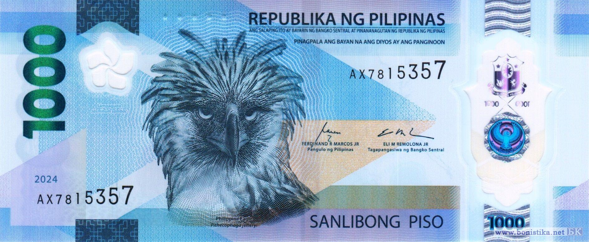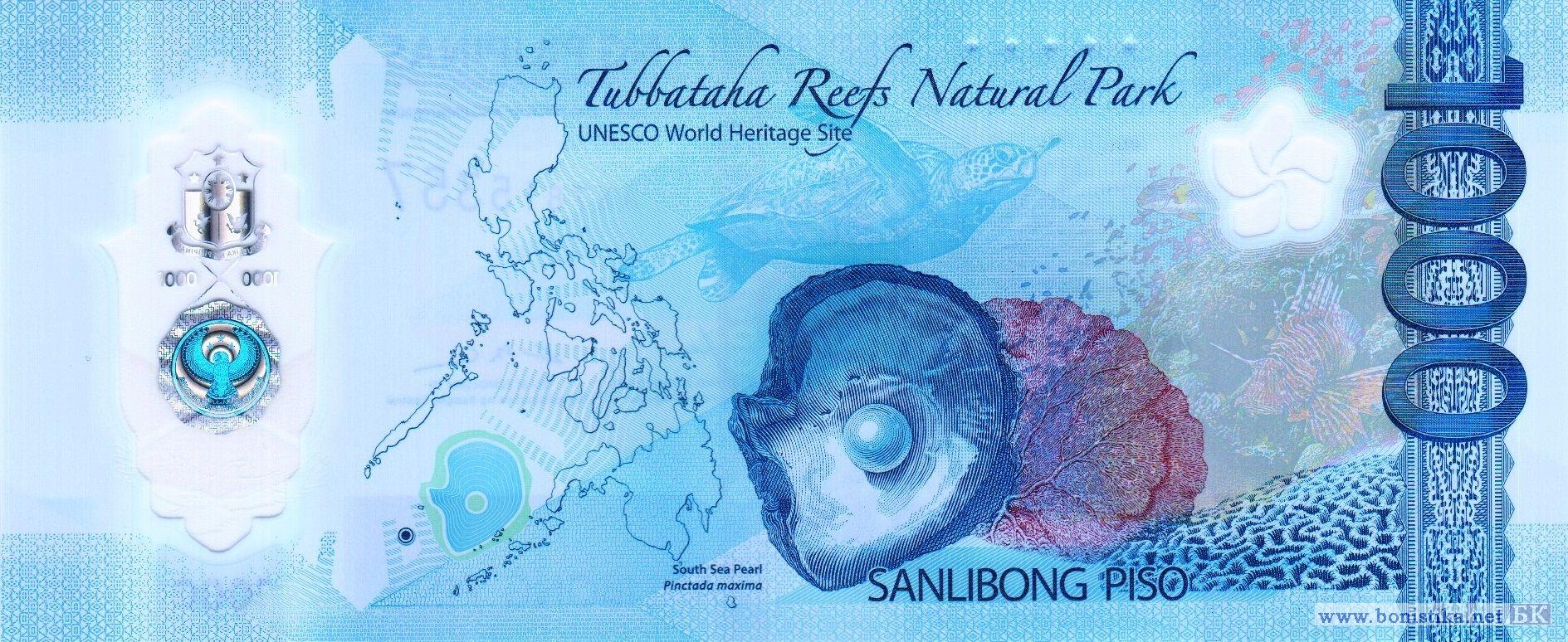 Стилизованное изображение цветка жасмина арабского, или жасмина индийского, или самбака (Jasminum sambac) – цветкового двудольного растения семейства маслиновых, является национальным символом Филиппин, голова филиппинского орла, или филиппинского обезьяноеда, или орла-обезьяноеда, или филиппинской гарпии, или гарпии-обезьяноеда (Pithecophaga jefferyi) – хищной птицы семейства ястребиных, птица является национальным символом Филиппин, новая эмблема Центрального банка. Карта Филиппин, черепаха бисса, или настоящая каретта (Eretmochelys imbricata) – позвоночное пресмыкающееся семейства морских черепах, раковины сереброгубых устриц, или белогубых устриц (Pinctada maxima) с жемчужиной – двустворчатых моллюсков семейства настоящих морских жемчужниц, рыбы, кораллы в морском природном парке Риф Туббатаха в провинции Палаван в центральной части моря Сулу, парк включён в список объектов Всемирного наследия ЮНЕСКО, рыба-крылатка, стилизованное изображение цветка жасмина арабского, узор традиционной ткани т’налак народа т’боли с острова Минданао.
