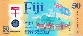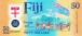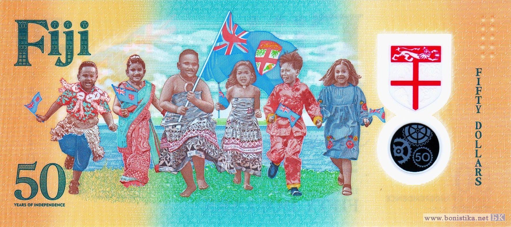 Геральдический щит герба Фиджи, циферблат часов, деревья, военнослужащие участники церемонии торжественного поднятия государственного флага. Бегущие по морскому берегу дети с флагами Фиджи, геральдический щит герба Фиджи, часовые шестерни.