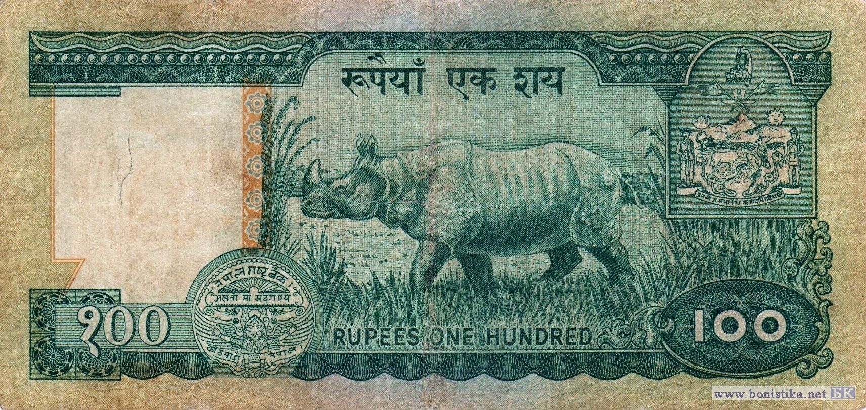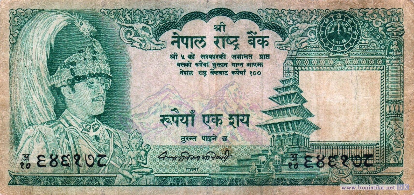 Король Бирендра Бир Бикрам Шах Дев, фрагменты резных деревянных барельефов из храма богини Таледжу (Дурги) в городе Катманду, статуя богини изобилия, богатства, удачи и счастья Лакшми, гора Нуптсе, высочайшая вершина земного шара – гора Сагарматха (Джомолунгма или Эверест) и гора Лхотсе в хребте Махалангур-Химал в горной системе Гималаи, пятиярусный храм-пагода Ньятапола на площади Таумадхи в городе Бхактапур. Эмблема Непал Растра банка, стебли растений, индийский носорог (Rhinoceros unicornis) – крупное непарнокопытное млекопитающее семейства носороговых.