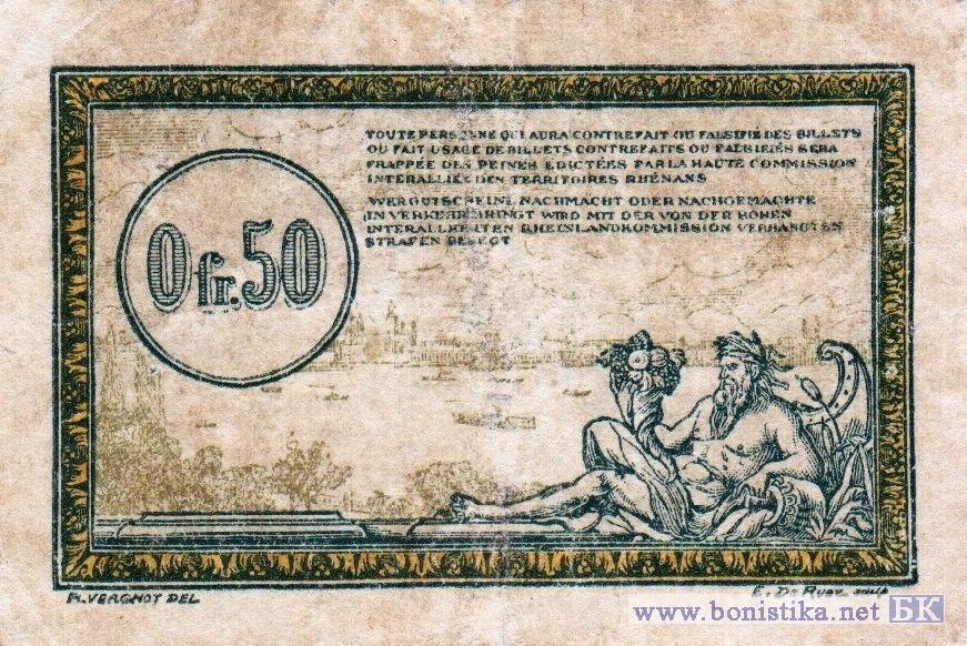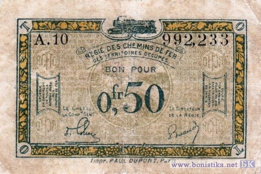 Вариант подписей: Colon - Bréaud. Принтер: IPDP - Imprimerie Paul Dupont, Paris. Банкноты выпущены в обращение управлением Франко-Бельгийской железной дороги на оккупированной территории Германии.