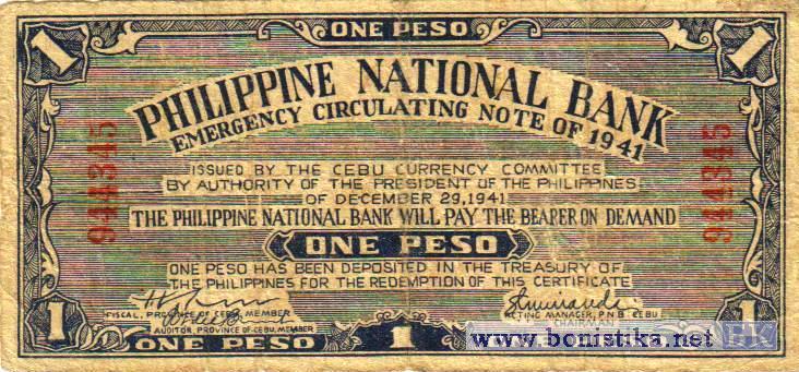 PHILLIPPINE NATIONAL BANK- CEBU, 1941 official emergency circulateing note issue, на желтой бумаге. серийный номер от 1 до 1000000