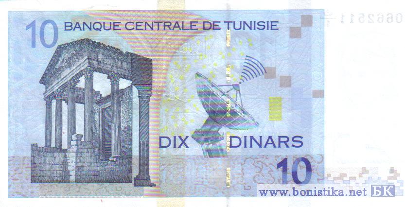 Аверс банкноты - мечеть в городе Кейруан. Мусульманская святыня на севере Африки. На реверсе - развалины древне римского города Дугга.