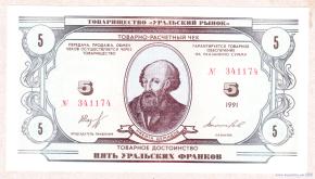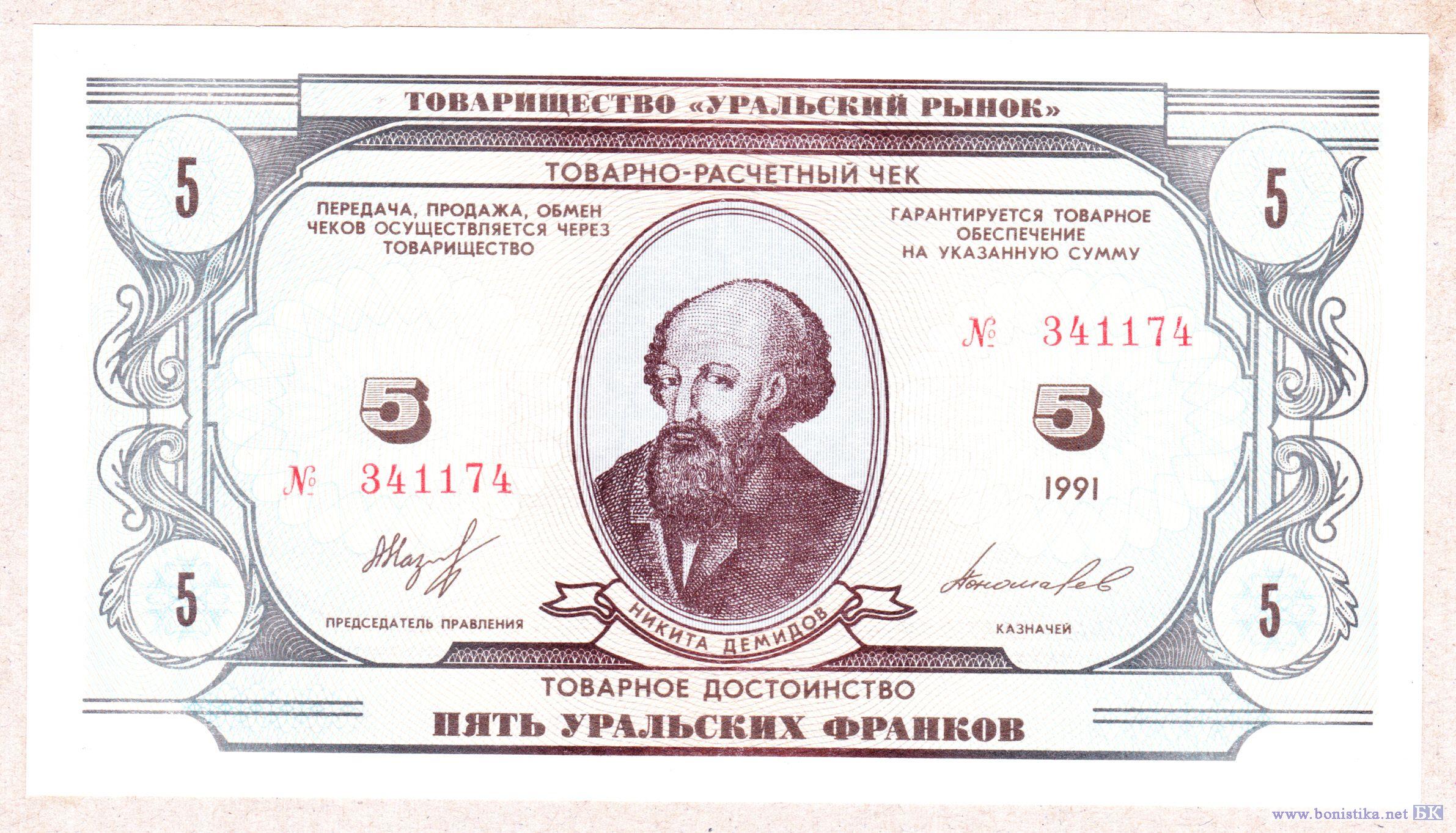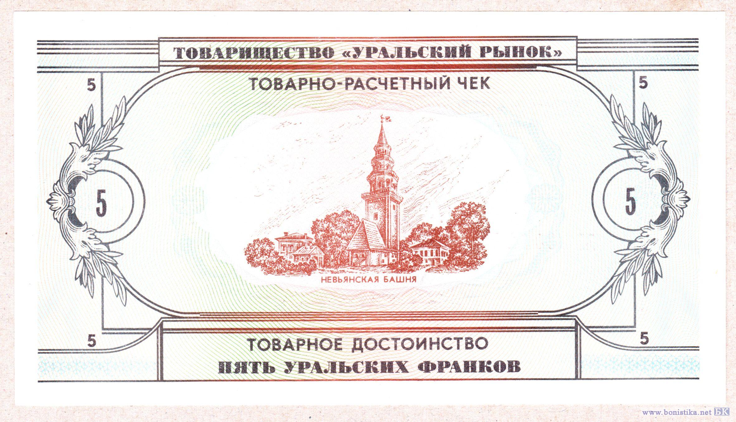 Товарно-расчётные чеки «уральские франки» были изготовлены в 1991 году на Пермской печатной фабрике «Гознак» по заказу екатеринбургского предприятия ТОО «Уральский рынок» и в соответствии с письмом-разрешением государственного производственного объединения производства государственных знаков Министерства финансов СССР от 04.09.91 г. № 01/2а-106 . Отпечатано было 1 миллион 930 тысяч штук номиналами 1, 5 10, 20, 50, 100, 500 и 1000 «уральских франков» на общую сумму в 56 млн. франков.