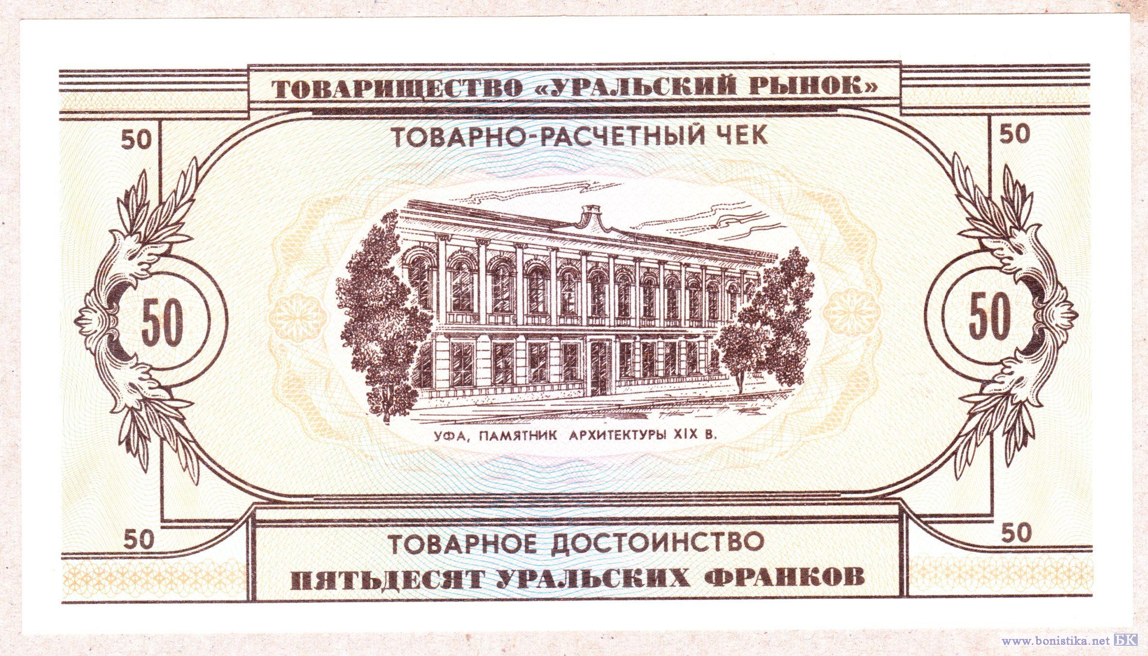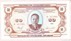 Товарно-расчётные чеки «уральские франки» были изготовлены в 1991 году на Пермской печатной фабрике «Гознак» по заказу екатеринбургского предприятия ТОО «Уральский рынок» и в соответствии с письмом-разрешением государственного производственного объединения производства государственных знаков Министерства финансов СССР от 04.09.91 г. № 01/2а-106 . Отпечатано было 1 миллион 930 тысяч штук номиналами 1, 5 10, 20, 50, 100, 500 и 1000 «уральских франков» на общую сумму в 56 млн. франков.