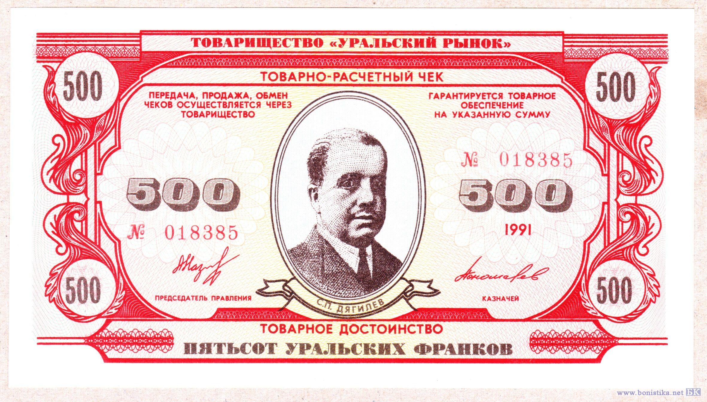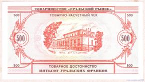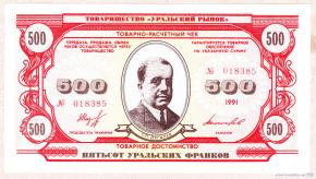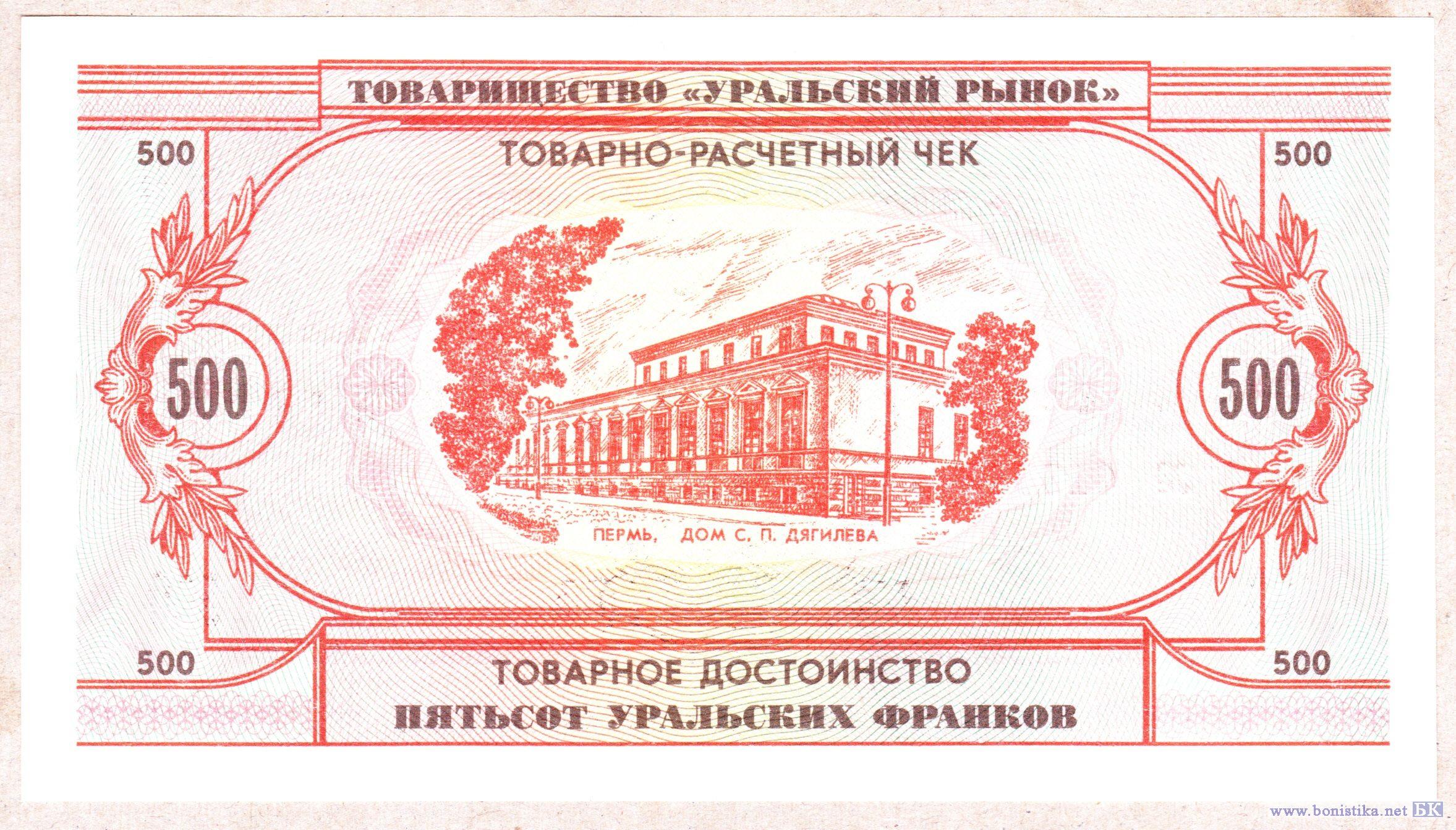 Товарно-расчётные чеки «уральские франки» были изготовлены в 1991 году на Пермской печатной фабрике «Гознак» по заказу екатеринбургского предприятия ТОО «Уральский рынок» и в соответствии с письмом-разрешением государственного производственного объединения производства государственных знаков Министерства финансов СССР от 04.09.91 г. № 01/2а-106 . Отпечатано было 1 миллион 930 тысяч штук номиналами 1, 5 10, 20, 50, 100, 500 и 1000 «уральских франков» на общую сумму в 56 млн. франков.