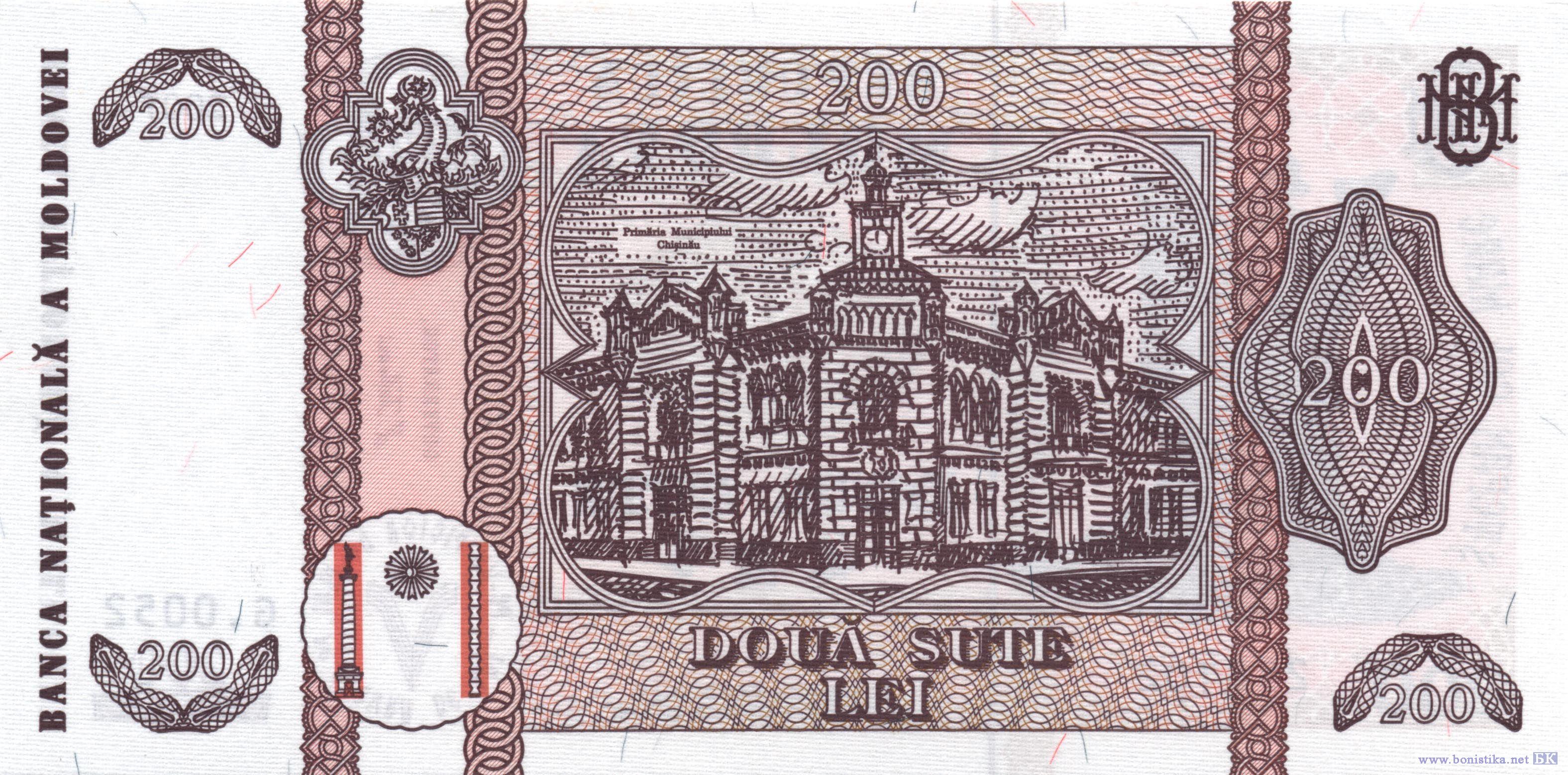 Реверс: Внутри рамы графическое изображение Мэрии Кишинэу и надпись "Primăria Municipiului Chişinău", номинальная стоимость в цифрах и буквах, три вертикальных декоративных элемента, герб Штефана чел Маре, стилизованное изображение колонны Трояна, Колонны Бесконечности и между ними полумесяц, название эмиссионного банка "BANCA NAŢIONALĂ A MOLDOVEI", художественно оформленная аббревиатура "BNM".