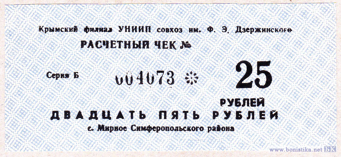 Расчётный чек. УССР, Крымский филиал УНИИП, совхоз им.Дзержинского, с.Мирное, Симферопольского р-на.