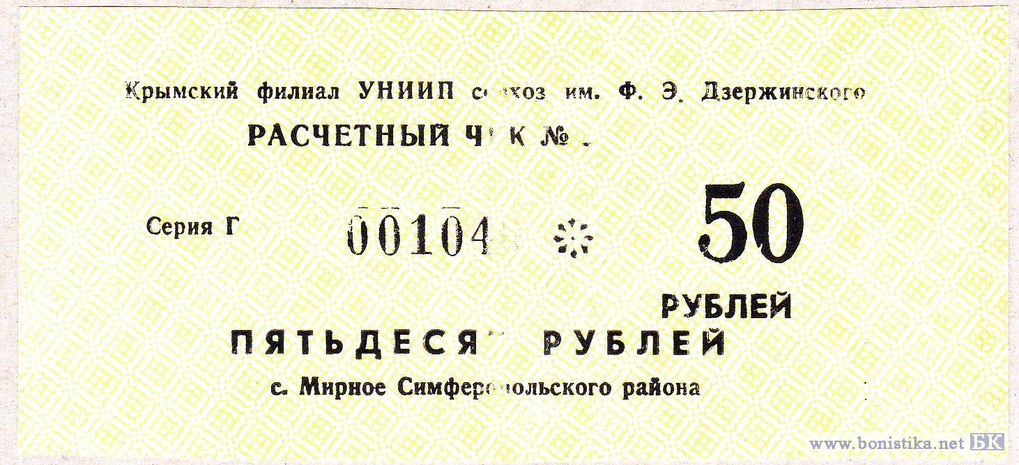 Расчётный чек. УССР, Крымский филиал УНИИП, совхоз им.Дзержинского, с.Мирное, Симферопольского р-на.
