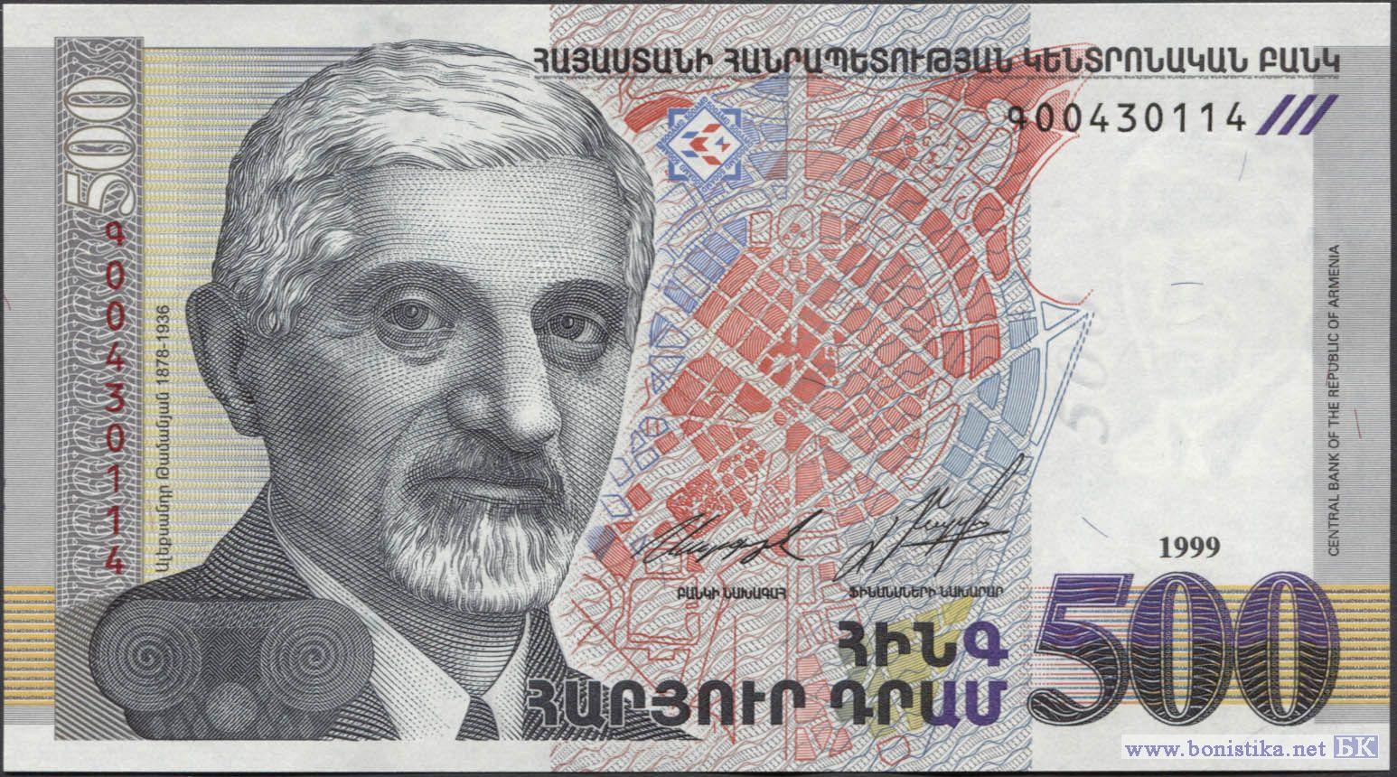 Аверс: портрет выдающегося армянского архитектора Александра Таманяна (1878-1936) на фоне стилизованной карты Еревана.