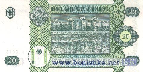 Реверс: Внутри рамы графическое изображение Крепости Сорока и надпись "CETATEA SOROCA", номинальная стоимость в цифрах и буквах, два вертикальных декоративных элемента, герб Штефана чел Маре, стилизованное изображение колонны Трояна, Колонны Бесконечности и между ними полумесяц, название эмиссионного банка "BANCA NAŢIONALĂ A MOLDOVEI", художественно оформленная аббревиатура "BNM".