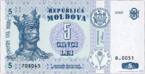 Аверс: Государственный герб Республики Молдова, надпись "REPUBLICA MOLDOVA", портрет Штефана чел Маре, многоцветный национальный орнамент, два вертикальных декоративных элемента, центральный гильош, номинальная стоимость в цифрах и буквах, художественно оформленная аббревиатура "BNM", факсимиле " GUVERNATOR, L. Talmaci", надпись по кругу "PE-UN PICIOR DE PLAI, PE-O GURA DE RAI...", стилизованное изображение литеры "V", год выпуска, номер и серия банкноты, надпись "FALSIFICAREA ACESTOR BILETE SE PEDEPSESTE CONFORM LEGILOR".