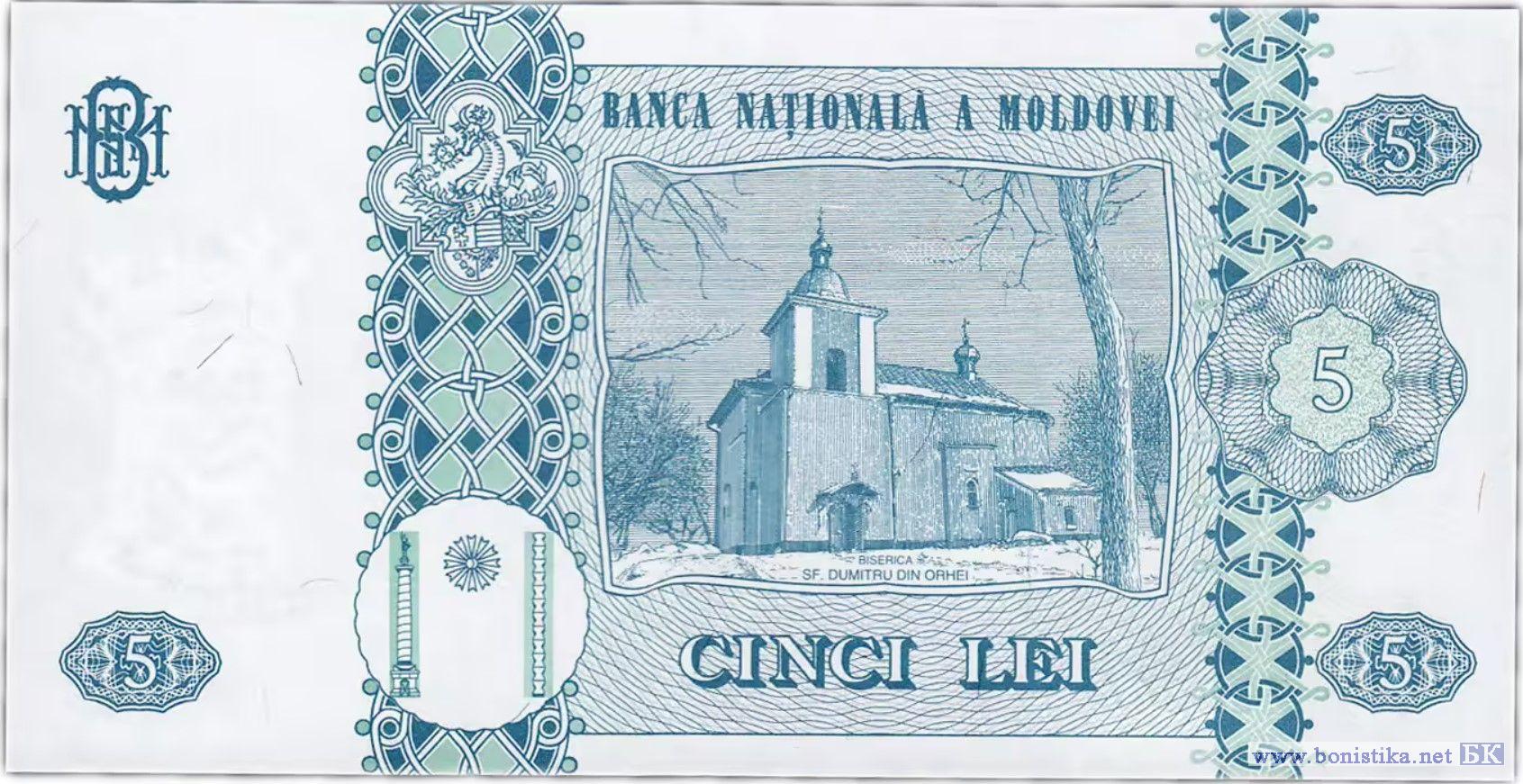 Реверс: Внутри рамы графическое изображение Церкви св. Думитру из Орхей и надпись "BISERICA SF.DUMITRU DIN ORHEI", номинальная стоимость в цифрах и буквах, два вертикальных декоративных элемента, герб Штефана чел Маре, стилизованное изображение колонны Трояна, Колонны Бесконечности и между ними полумесяц, название эмиссионного банка "BANCA NATIONALA A MOLDOVEI", художественно оформленная аббревиатура "BNM".