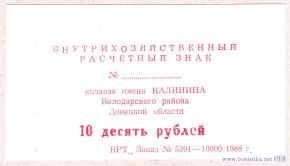 Донецкая область, Володарский район, с. Касьяновка. Колхоз им. Калинина. Внутрихозяйственный расчетный знак.Односторонняя.