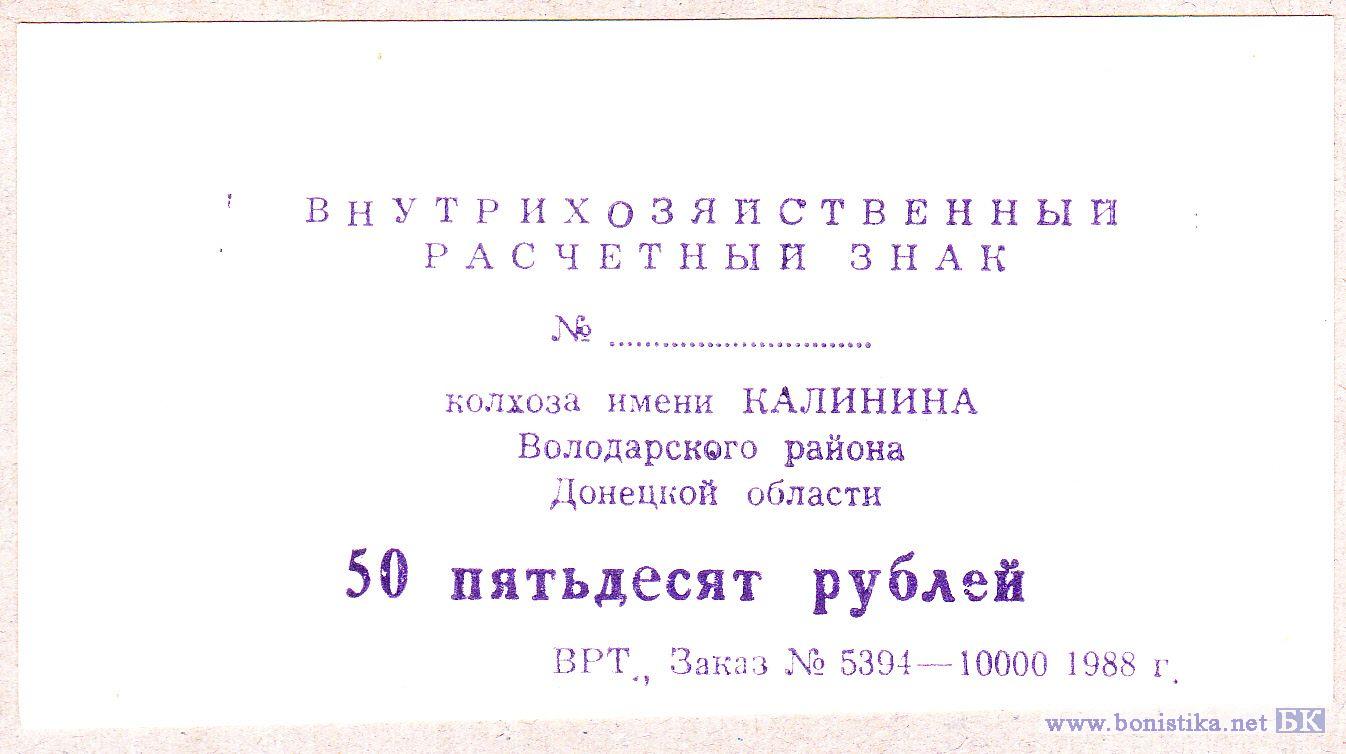 Донецкая область, Володарский район, с. Касьяновка. Колхоз им. Калинина. Внутрихозяйственный расчетный знак. Односторонняя.