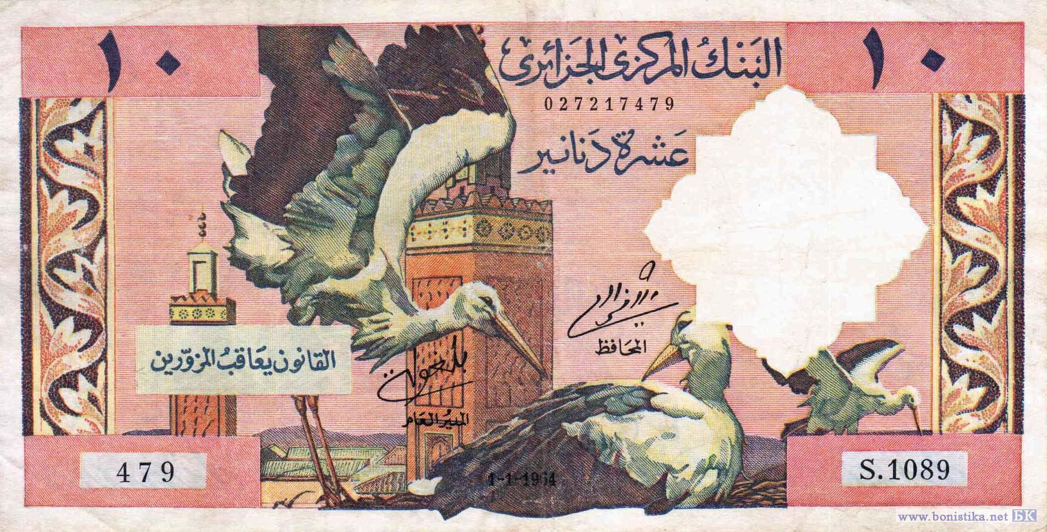 Тип а. Стиль цифр серийного номера и даты - 1-го типа, серийный номер 2-го типа: три цифры, одна литера и четыре цифры. Вариант подписей № 1: Bouasria Belghoula - Seghir Mostefai. Принтер: BF - Banque de France.