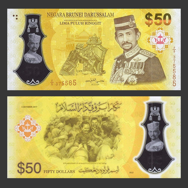 Не будет. В 2017 году выпущена памятная банкнота 50 бр. долларов в честь юбилея восшествия султана на престол. С тех пор её регулярно перевыпускают. Последняя эмиссия 2022 года.