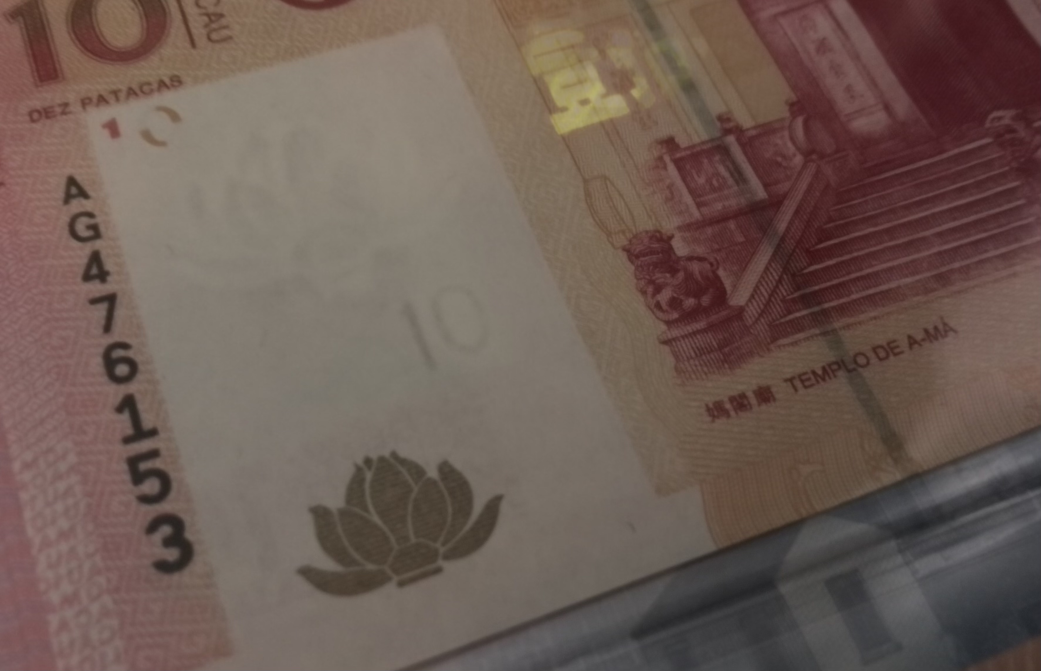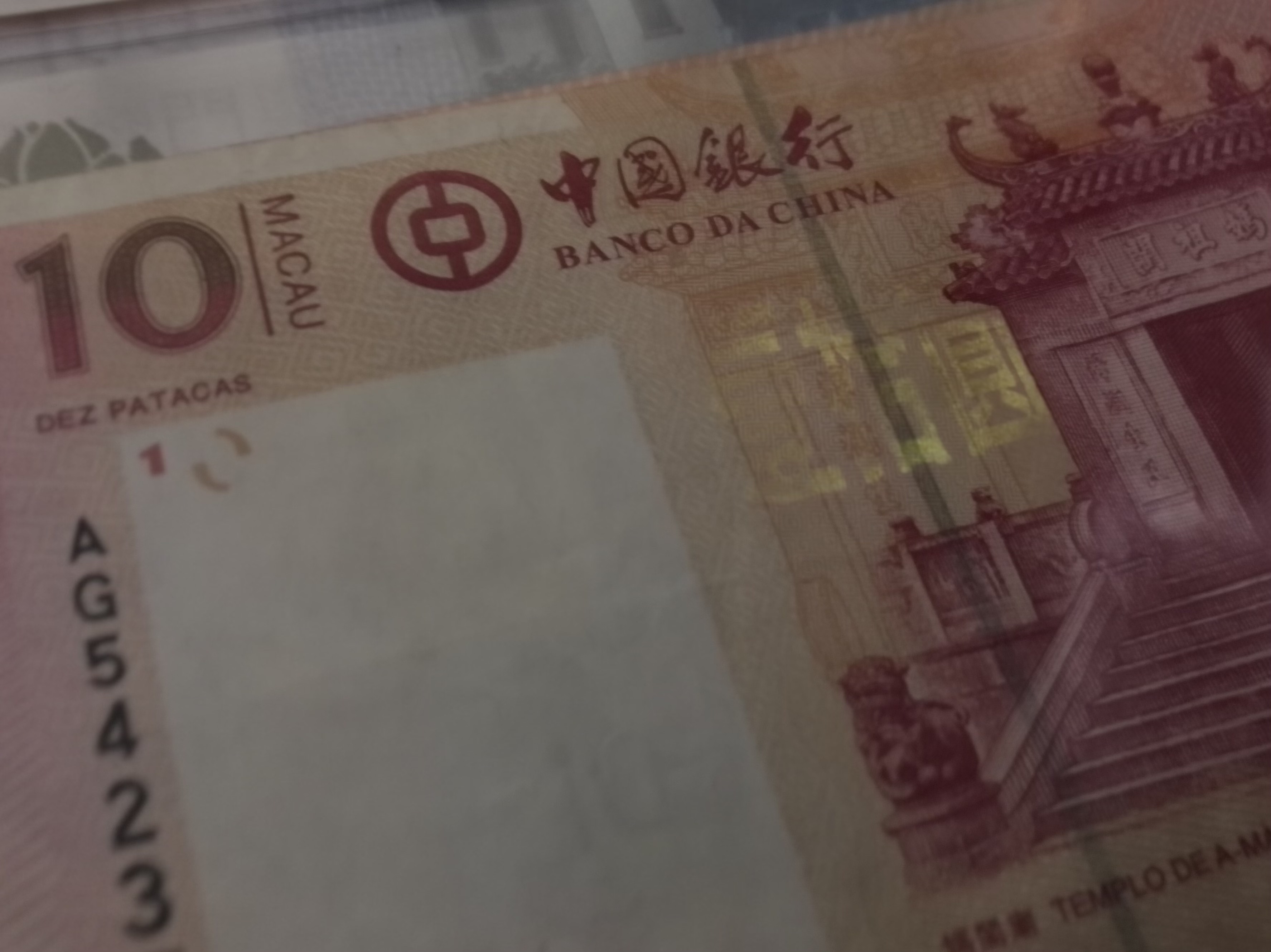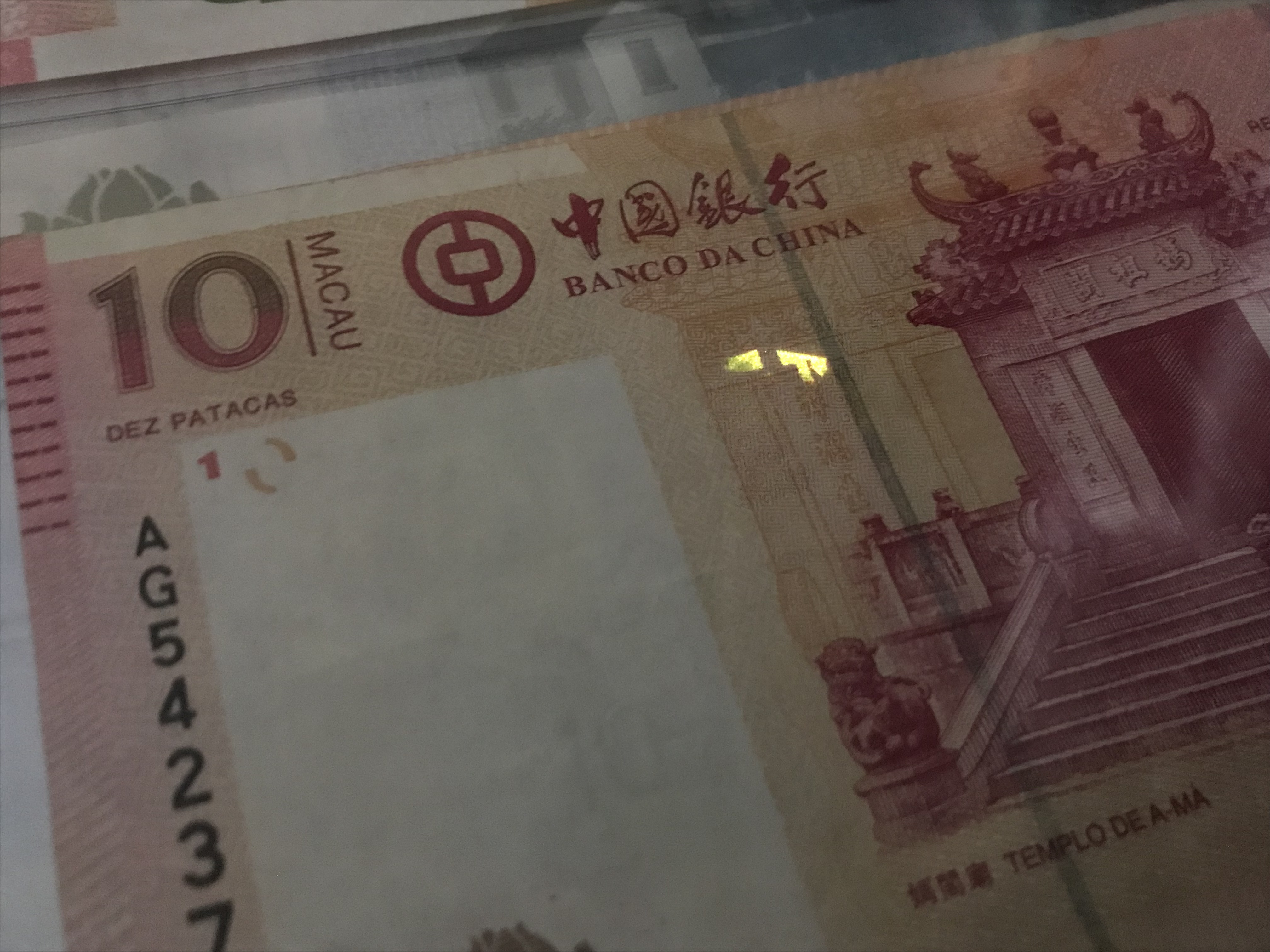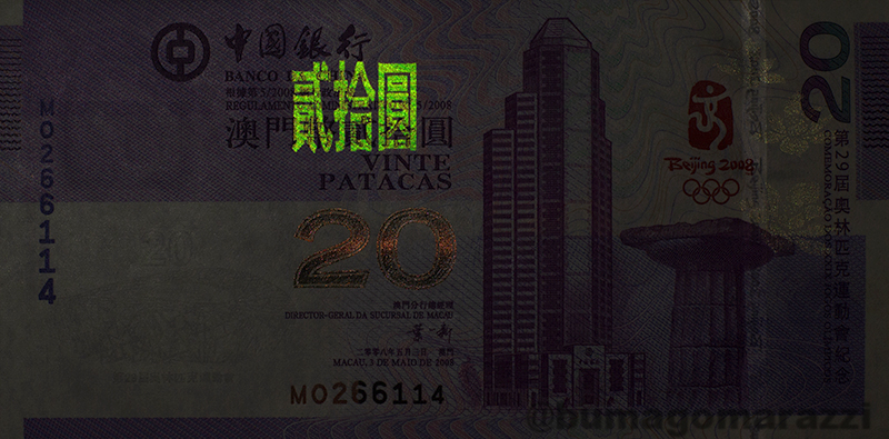 Но зато повезло на другой Олимпиаде - тоже пекинской, но прошедшей в 2008 году. Напомню, ей посвящались сразу три банкноты: 10 юаней Народного банка Китая, 20 гонконгских долларов Банка Китая и 20 макаоских патак Банка Китая. К сожалению, 10 юаней мне недоступны, а вот две оставшиеся удалось изучить, и на одной из них - удача! - присутствует метка, выполненная антистоксовыми люминофорами.