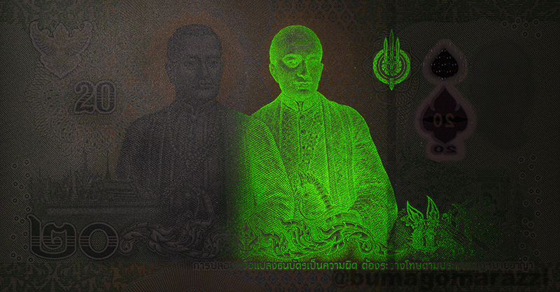 Еще одна новинка от банка Таиланда - попытка заменить младший номинал в существующей линейке на полимерный. И вновь интересная находка - на новой двадцатке присутствуют антистокс-метки, и это уже вторая обнаруженная полимерная банкнота, защищенная этим признаком.