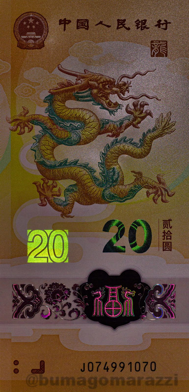 Продолжение от Народного банка Китая - 20 юаней в честь наступающего (уже вот-вот наступит) Года Дракона. Банкнота на полимерной основе, яркая, красивая, но в рамках темы она интересна для нас другим: защитный антистокс-элемент на своём законном месте (там же где и УФ метка), и выглядит вполне классически - номинал в квадрате.