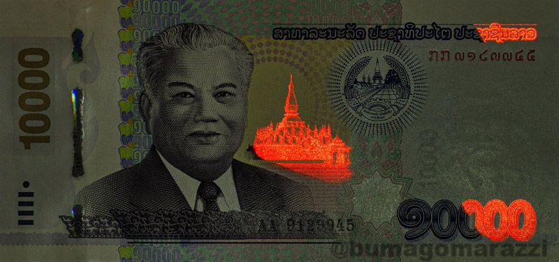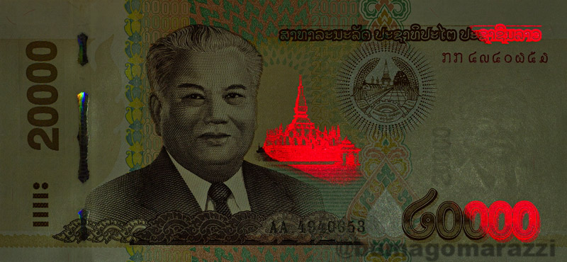 Лаосские новинки, выпущенные Гознаком, также имеют антистокс защиту. Антистоксовые метки имеют не только различное расположение для разных номиналов, но и различный цвет - оранжевый и красный. Нанесение люминофора достаточно плотное, не чета первым выпускам 10.000 и 20.000 кипов, свечение детектируется уверенно.