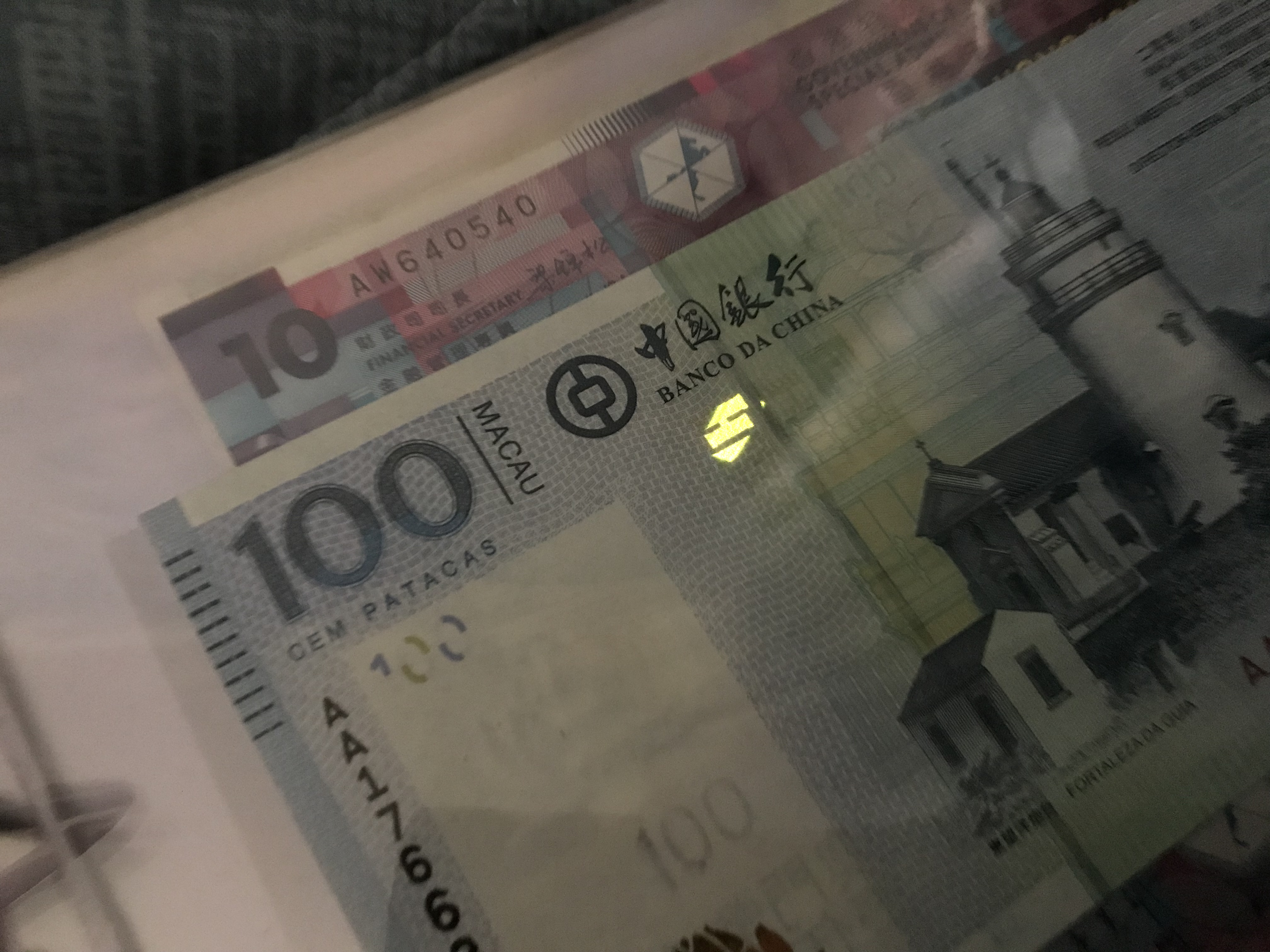 Макао - были обнаружены метки на банкнотах 2005-2013 годов (108a, 108b, 109a, 111a, 80a). Удивился, что на банкноте 10 патак 2005 года (80a) метка хоть и слабая, но есть, а на аналогичной 2013 года (80c) не нашёл - но, возможно, виной тому потрёпанное состояние последней.