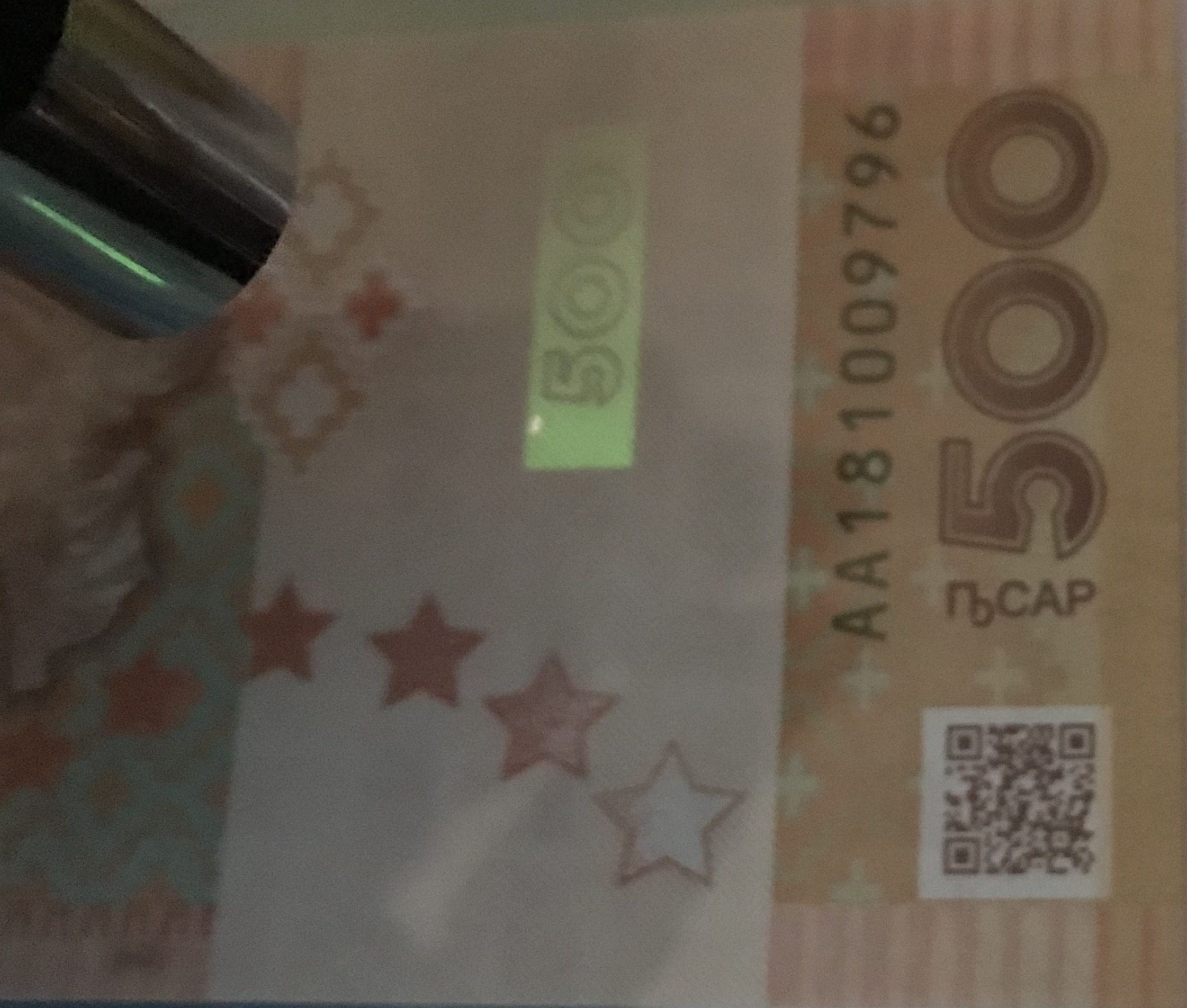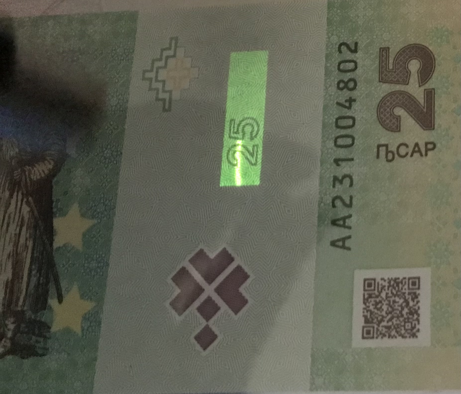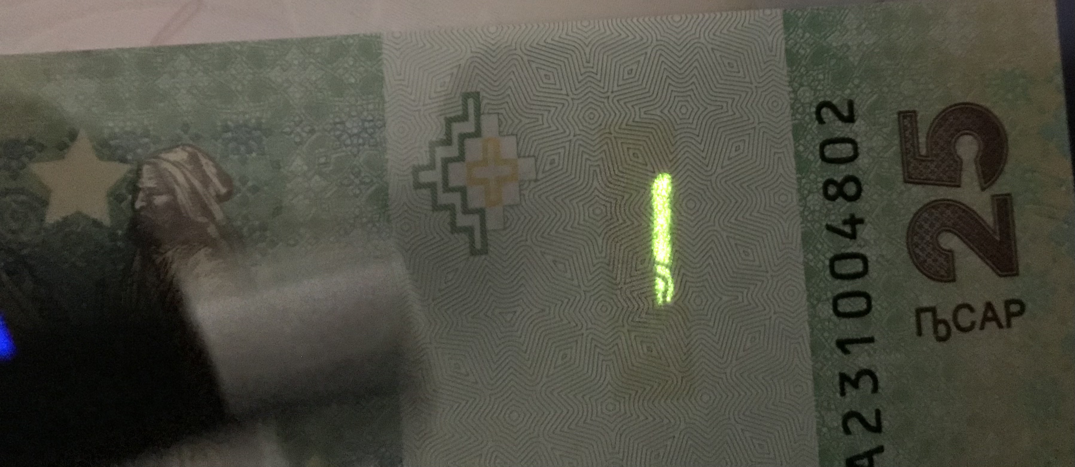 Купюры Абхазии 500 апсар 2018 и 25 апсар 2023 имеют метки, причем на 25 она куда как ярче светится. На двух фото подсвечивал ещё и ультрафиолетом - метка «работает» сразу в обоих диапазонах