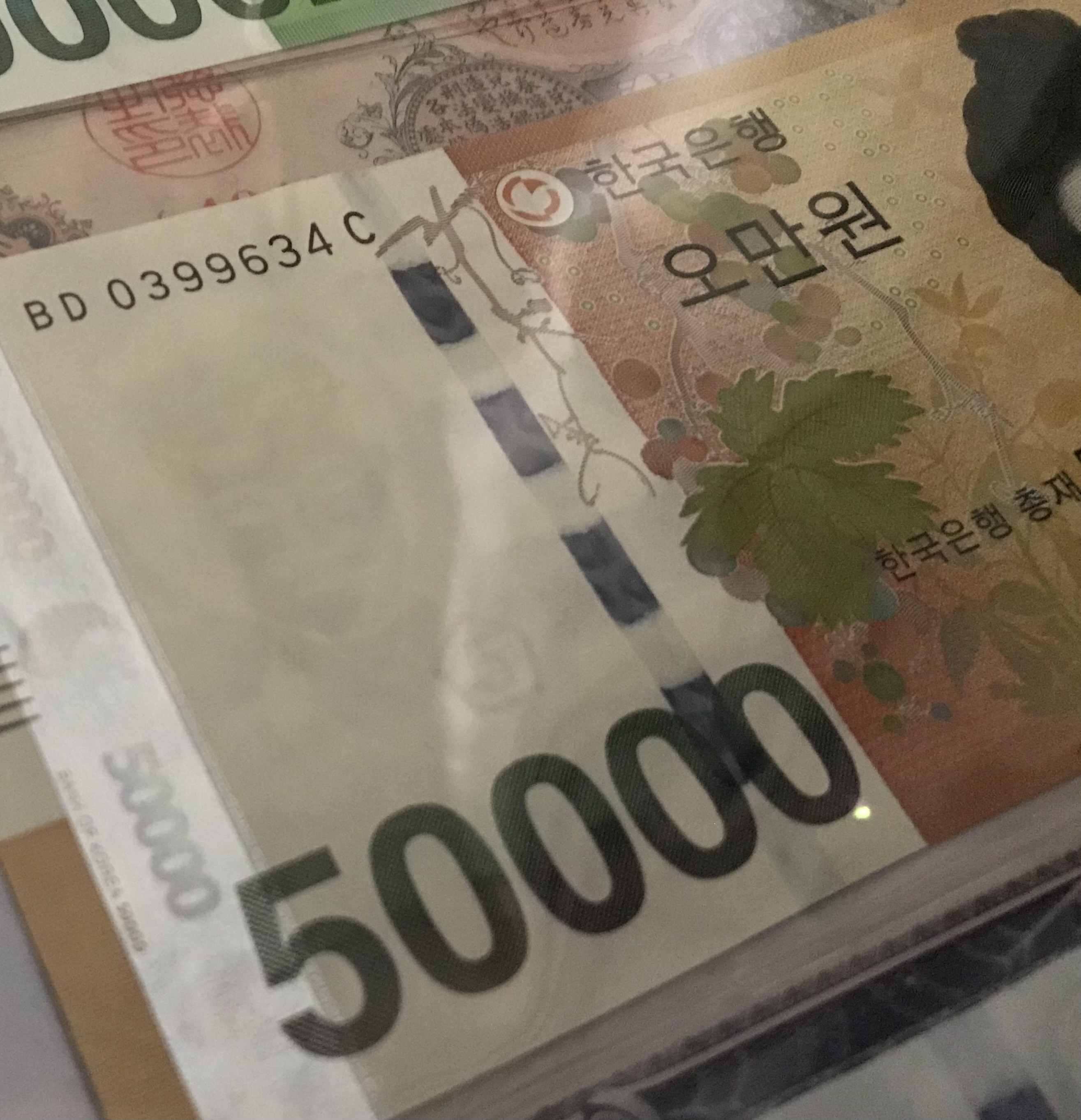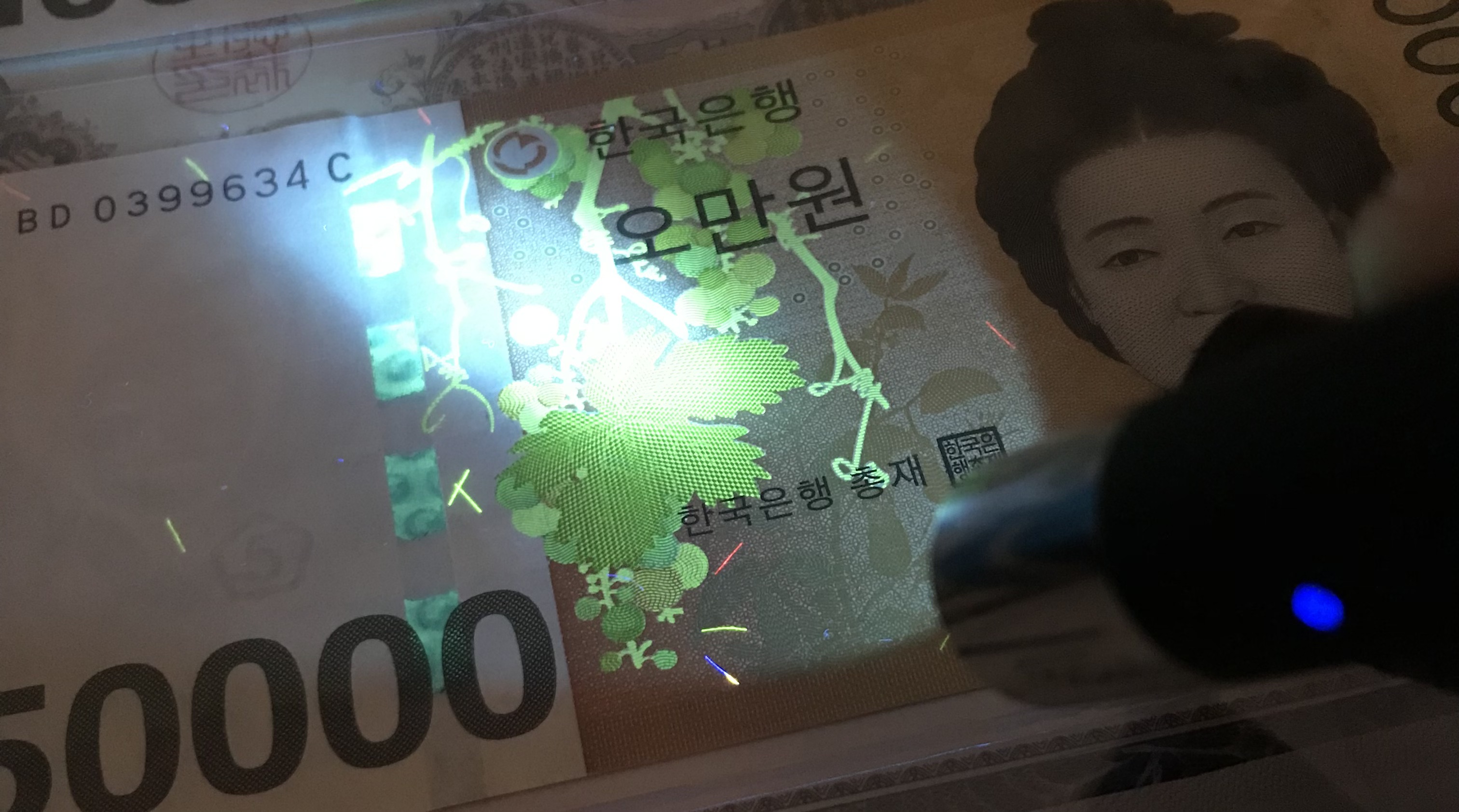 Необычная антистокс защита на корейской P-57 - 50000 вон. Там светится часть защитных волокон - те, что в УФ светятся синим. На других номиналах «синие» волокна таким свойством не обладают. На фото с УФ подсветкой одновременно нижнее из синих волокон облучаю ИК - его часть светится ярче за счёт этого.