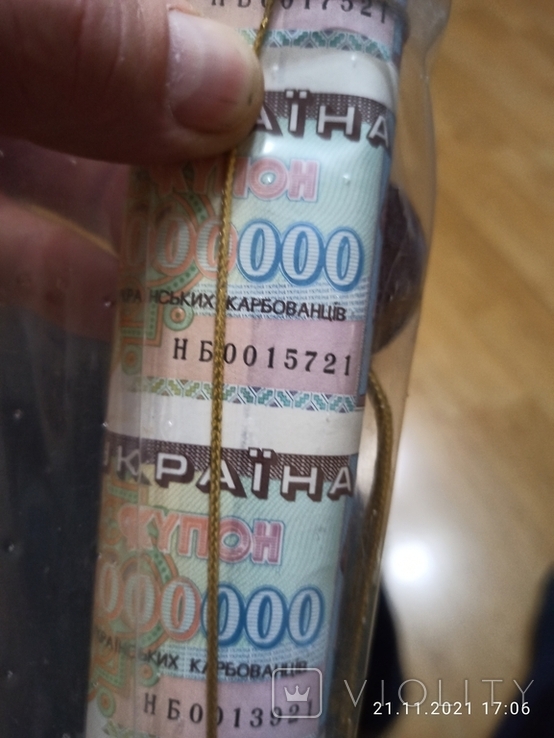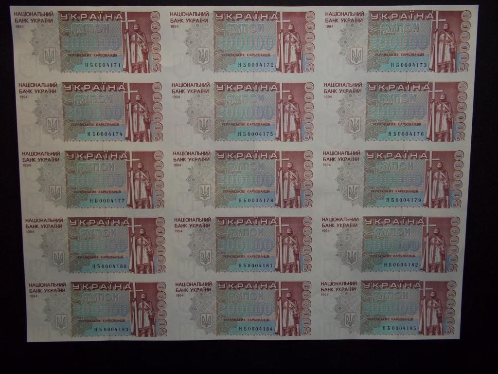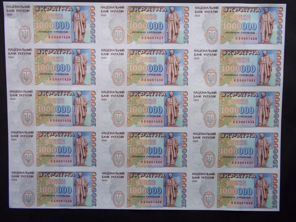 Лет 15 назад на Аукро продавалось довольно большое количество листов 3 х 5 номиналами 200000, 500000 и 1000000 карбованцев в декоративной рамке. Я тогда купил где-то по десятку этих рамок. Кроме этого этот же продавец из Днепра продавал эти же номиналы в розницу серия НБ. По номерам все они вписывались в представленную выше квоту. И как я понимаю они были порезаны еще на фабрике. Ведь если в листе 6 х 12 =72 банкноты, то из этого листа можно сделать 4 листа 3 х 5 и вставить их потом в рамку. От листа остается остаток 6 х 2 = 12 штук. Скорее всего этот остаток потом разрезали поштучно. Всего было полных около 20 листов (1500 поделить на 72 =20.833). Из которых получилось где-то 80-82 декоративных рамки.