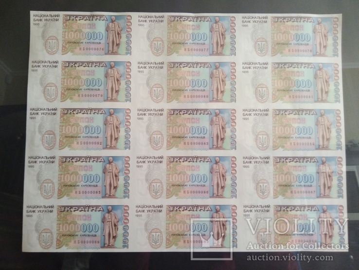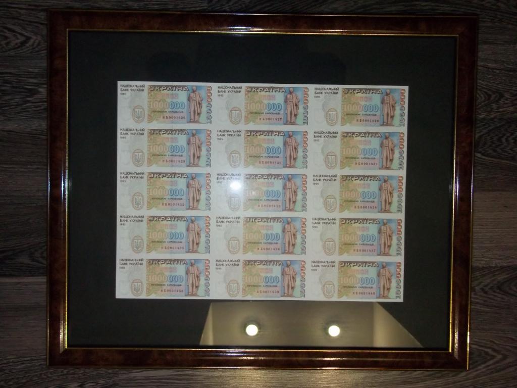 в) аркуші з 15 банкнот номіналом 1 000 000, обрамлених декоративною рамкою.