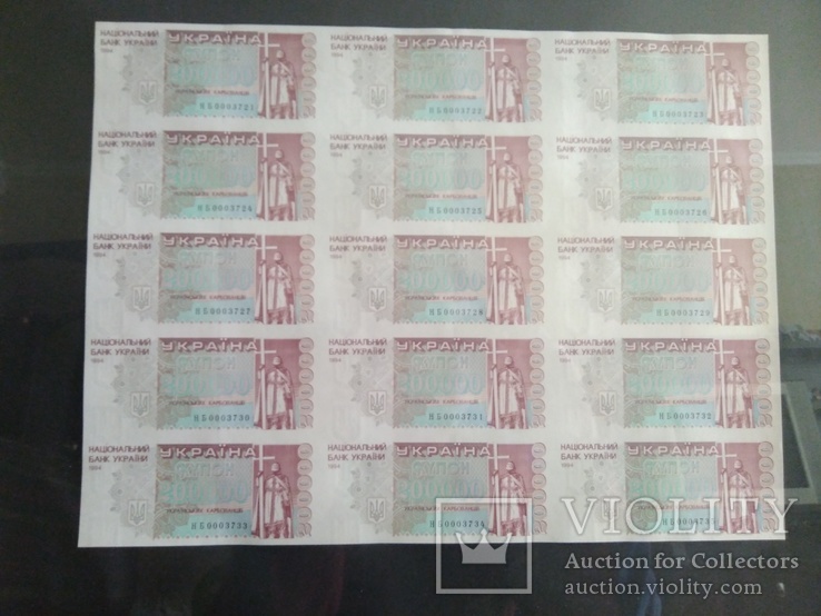 а) аркуші з 15 банкнот номіналом 200 000, обрамлених декоративною рамкою;