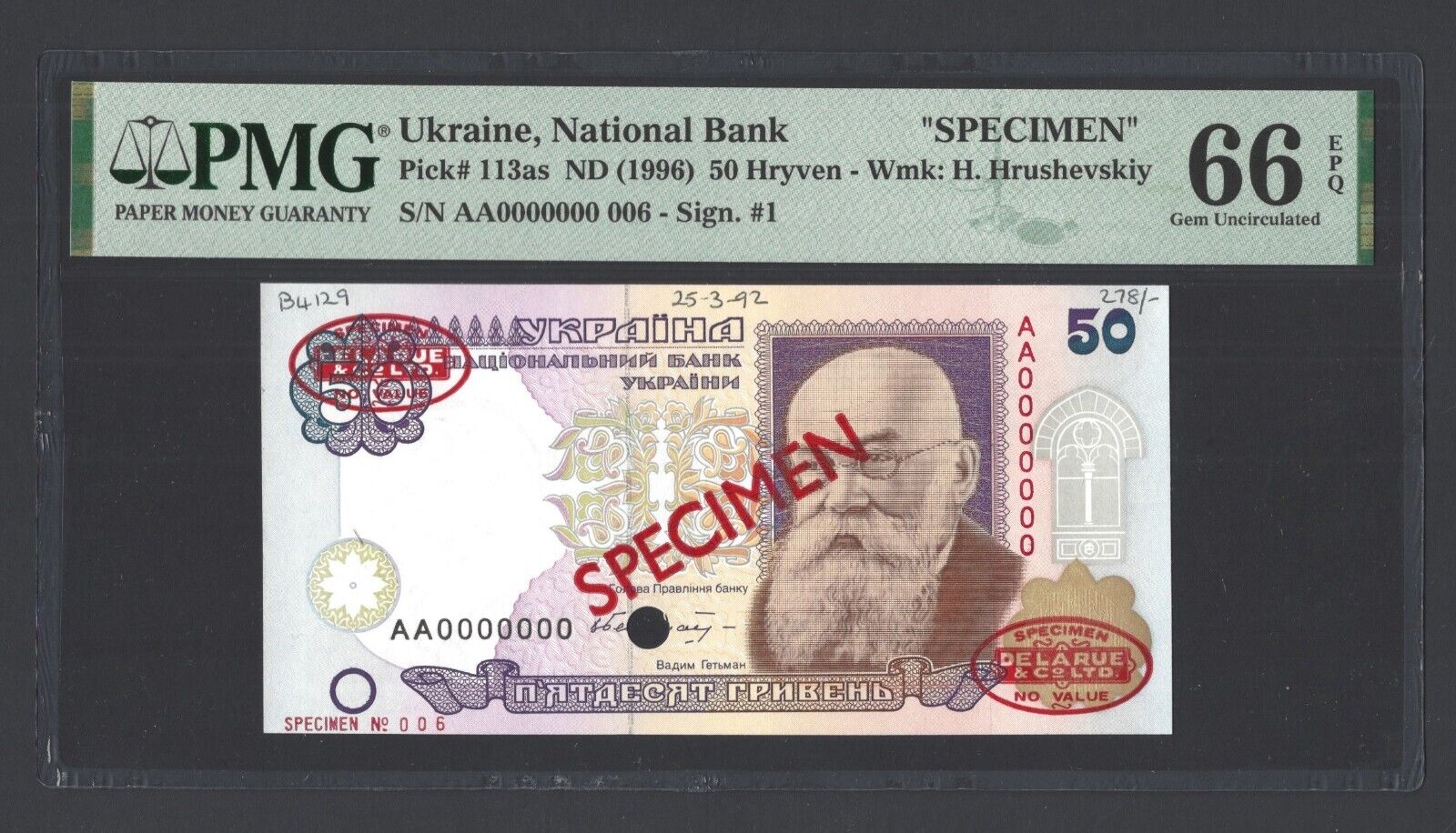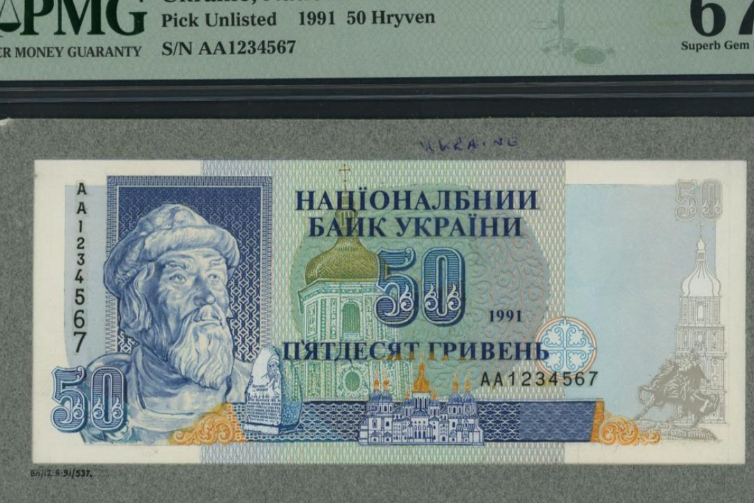50 Гривен 1991 год. Судя по скану он был выдран из папки. Загрейдили и выставили на аукцион.