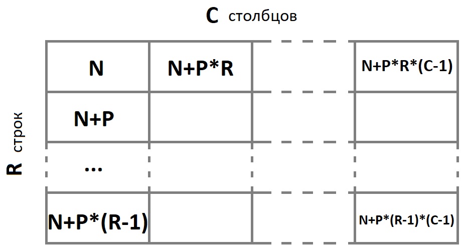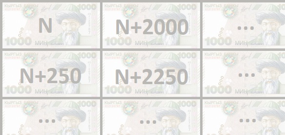 Но вернемся к третьему выпуску Киргизии. Итак, невооруженным взглядом видно, что изменения серии на листе не наблюдается, а уникальность обеспечивается некоторым математическим сдвигом в номере (кстати, аналогичная схема использовалась для того самого листа сторублевок серии сН). Итак, схема: каждая банкнота, расположенная ниже текущей, имеет номер на P больше, чем текущая. Тогда банкнота, расположенная правее текущей будет иметь номер P*R, где R - это количество банкнот на листе по строкам. К сожалению, не имея полного листа, невозможно как-то вычислить количество столбцов банкнот (обозначим это количество как C)... От чего зависит число P - не совсем понятно, так как оно различается в разных нарезках даже для одного номинала. По моим предположениям, P - это количество листов в партии, отправленной на нумерацию. Таким образом, после нумерации и разрезки всей партии получаются банкноты, пронумерованные от N до N+P*(R-1)*(C-1); машинке для нумерации (или ее оператору) остается лишь запомнить это число и использовать его когда придет на нумерацию следующая партия. В картинках прикреплю иллюстрацию к этой схеме.