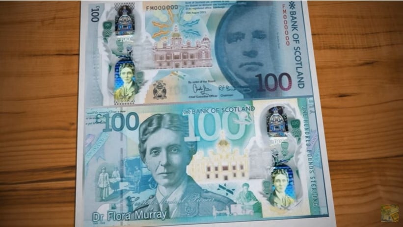 | Новая полимерная банкнота Bank of Scotland Plc номиналом 100 фунтов стерлингов выпущена с 4 апреля 2022 года. Она посвящена доктору Флоре Мюррей.