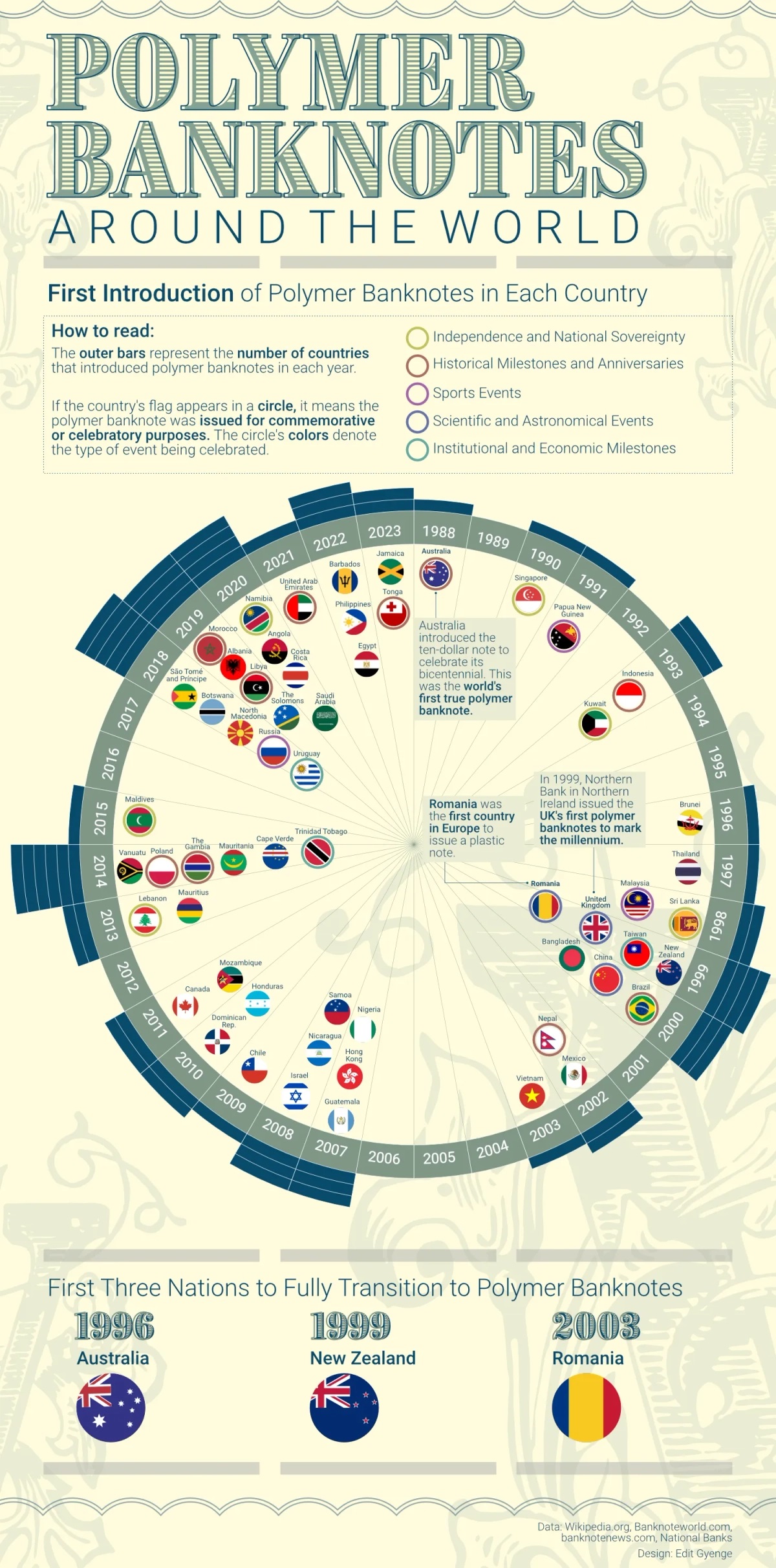 Круговая диаграмма - с 1988 по 2023 год - рассказывает, какая страна в каком году выпустила свою первую полимерную банкноту.