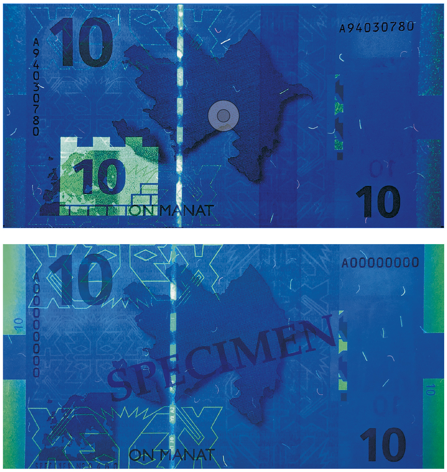 И сразу же следующий вопрос — 10 манатов 2005 года. Так же отличие между образцовой и обычной купюрами. Хотелось бы сравнить с другими.