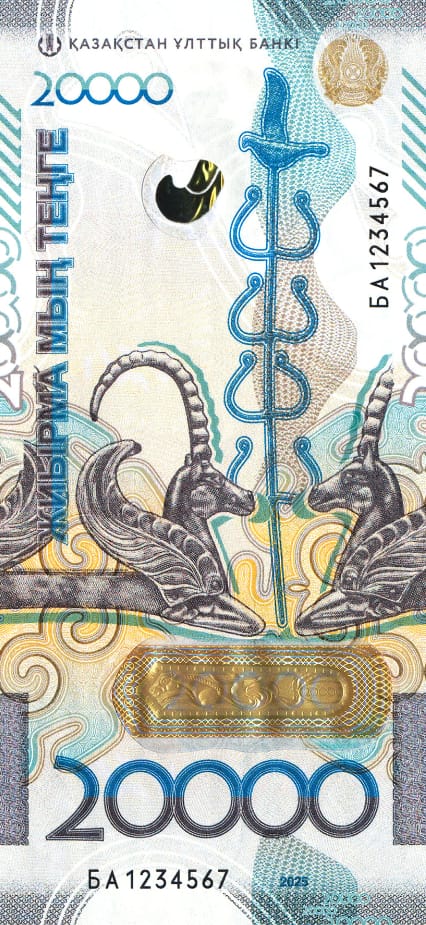 Изображение монеты на банкноте подано в едином дизайне как одно целое, и вместе банкнота и монета представляют единый образ Национальной валюты – тенге. С обеих сторон банкноты также вписана «лента Мёбиуса» как символ бесконечного движения.