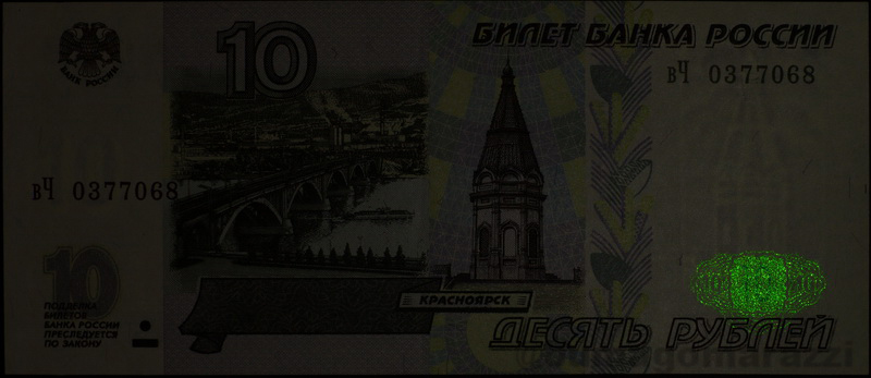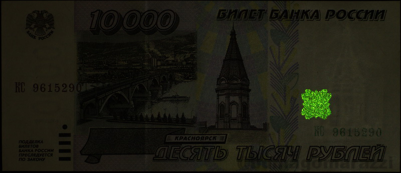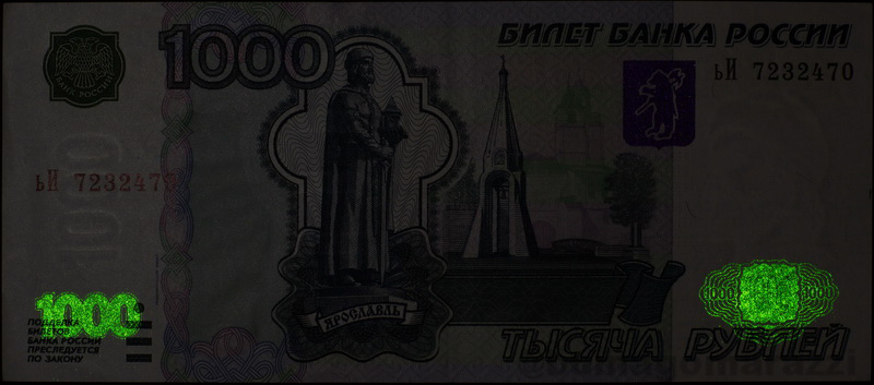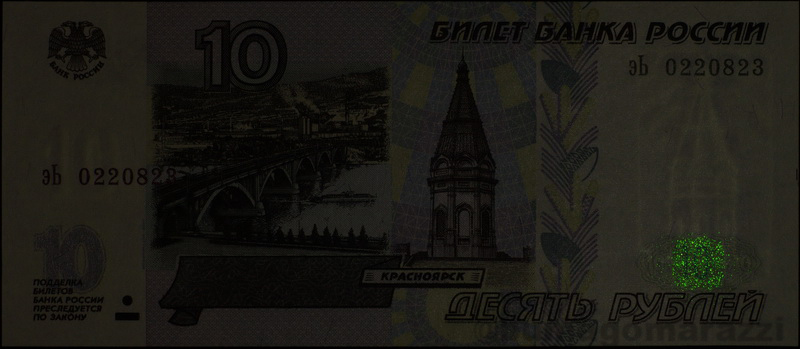 Последняя модификация 2010 года была проведена для трех старших номиналов и добавила красное свечение для правого номера банкноты у 1000 и 5000 рублей, а также еще одну метку на гербе пятитысячной... По интенсивности свечения люминофор на гербе выделяется - возможно, было принято во внимание то, что основные метки имеют невысокую яркость и при дневном свете малоконтрастны (а может и по другим причинам, кто ж нам расскажет?)