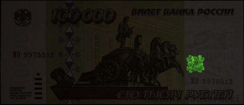 Результат. Начнем с той самой серии 1995 года. На банкнотах нанесена единственная антистокс-метка в виде розетки, не особо различимой в обычном свете, но люминесцирующей также при подсветке ультрафиолетом. Банкноту в 500 000 рублей сфотографировать не удалось по причине отсутствия банкноты.
