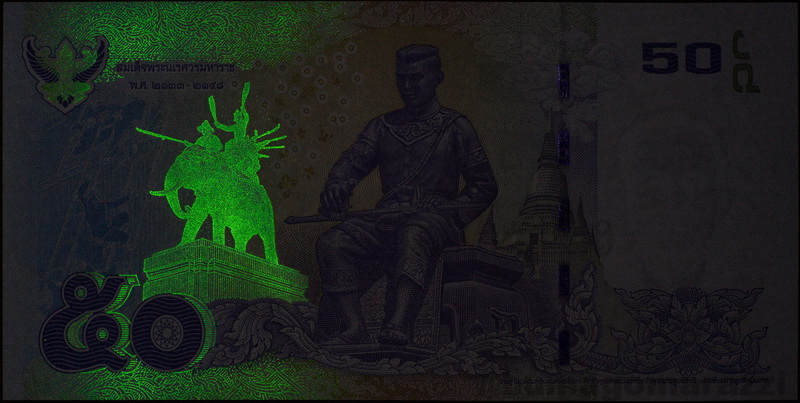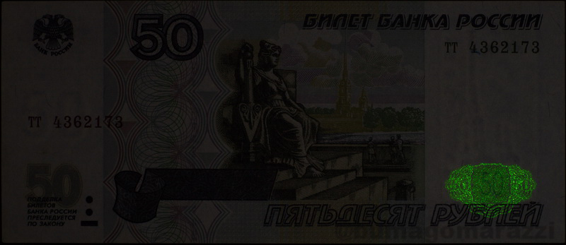 Среди банкнот Ирана было обнаружено свечение на 50.000 "дотомановских" риалов, причем на обоих видах - обычной с "мирным иранским атомом" (P149) и памятной с Тегеранским Университетом (P155). На обычной виден интересный градиент цвета свечения люминофора. На памятной люминофор распределен как-то очень неравномерно, красивое фото не получилось.