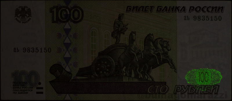Первая модификация 2001 года, в которую была добавлена тысячерублевая банкнота, претерпела некоторые потери в плане Спецэлемента И, теперь свечение центра розетки значительно превосходит свечение окружающих его линий. Порой линии представлены всего несколькими частицами люминофора. Не совсем понятно, может ли это быть связано с состоянием банкнот, подвергшихся исследованию, или же со спецификой нанесения. Думаю, можно ожидать, что износ люминофора должен быть равномерным в процессе эксплуатации банкноты, и поэтому стоит связывать такое распределение люминофора скорее с изготовлением, нежели с состоянием. По ожидаемым причинам представлены не все номиналы.
