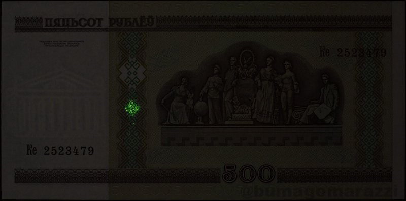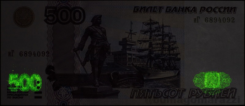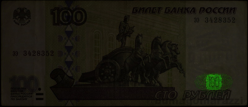 Были найдены всего три правдоподобные фотографии этого признака. В журнале Водяной Знак: фрагмент тысячерублевой банкноты современного образца в №105 и фрагмент тысячерублевой банкноты, но образца 1995 года, в №111. Также по Интернету с сайта на сайт гуляет изображение пятитысячной банкноты с помеченными зеленым цветом интересующими нас местами, но на этом всё. Изредка можно увидеть картинку с реальной люминесцирующей точкой, но адекватных фотографий, где был бы полностью визуализирован этот признак нет.