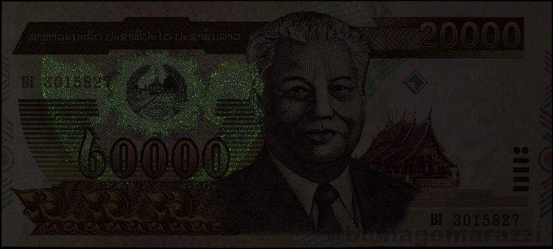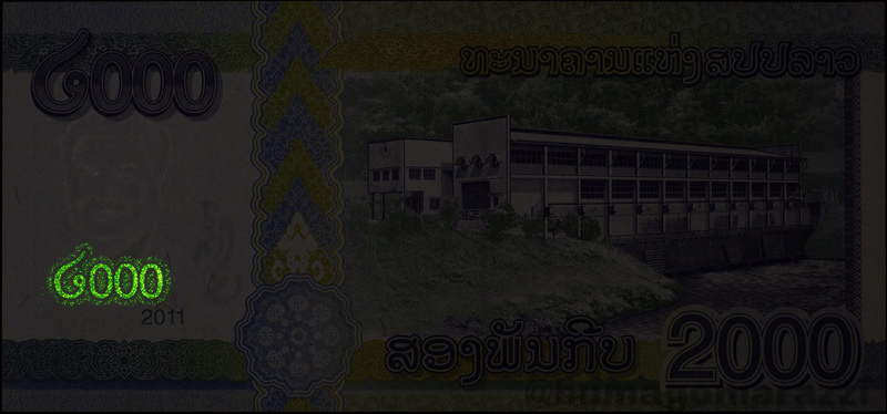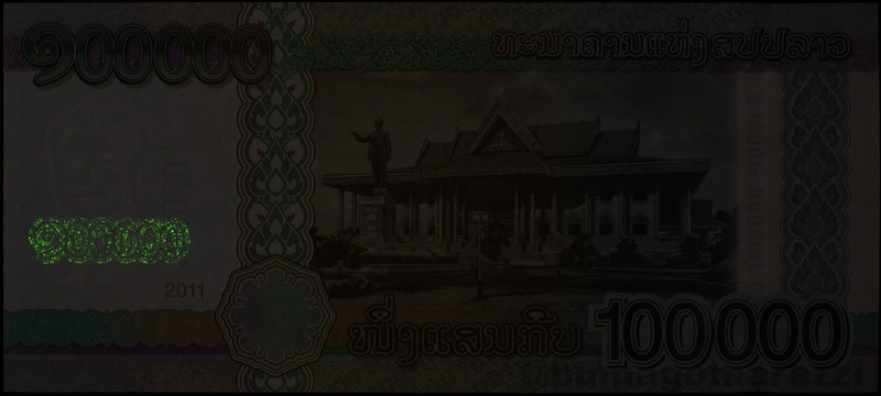 Например, для Лаоса впервые эта защита применена на двух банкнотах 2003 года (может быть даже 2002, но у меня есть только 2003 - P35b и P36b) и на юбилейной 2010 года (P40; лучики из центра банкноты - не антистокс, это результат блика вспышки, они видны невооруженным взглядом). Также из двух номиналов 2011 года (P41, P42) старший может похвастать наличием меток на обеих сторонах банкноты, что необычно. Стоит сказать, что во многих случаях производители размещают антистокс-метку в том же месте, где находится одна из УФ-меток (можно предположить, что это делается для удобства обучения кассиров, но это только предположение). На банкнотах Лаоса 2003 года антистоксов люминофор нанесен очень "рыхло" - не понятно, что могло бы стать причиной для этого.