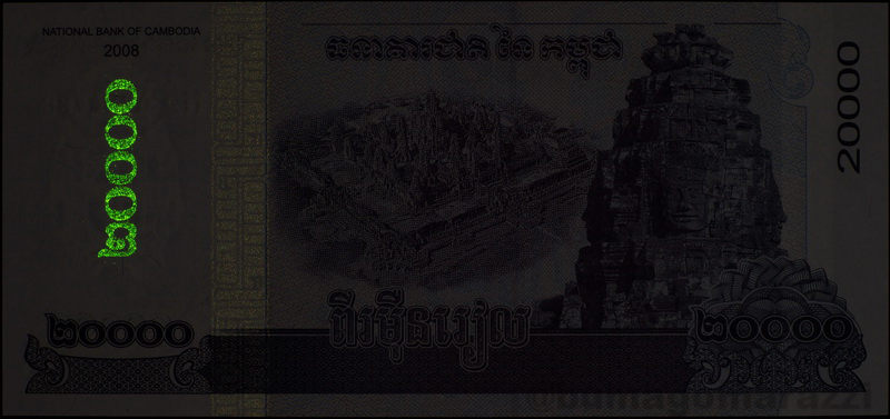 Помимо Лаоса этот тип защиты обнаружен на одном из номиналов Камбоджи (P60). Почему-то только один и почему-то не самый крупный. Слегка подсвеченная полоска с повторяющимся номиналом рядом с купонным полем - это блик от вспышки.