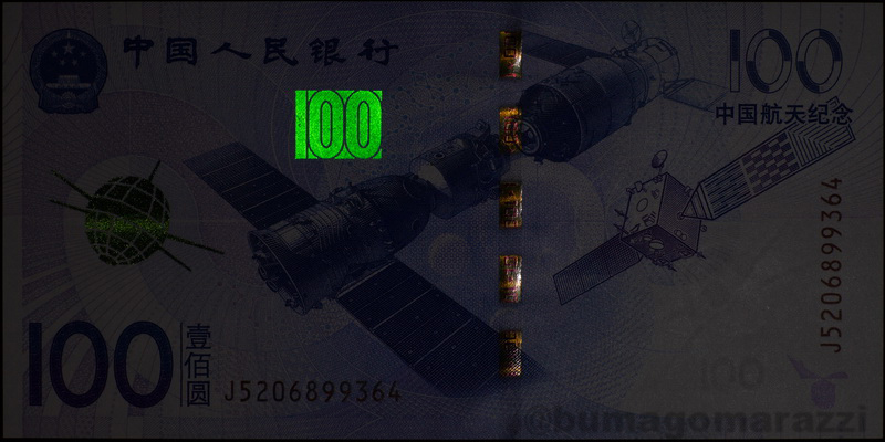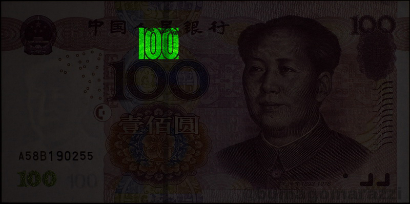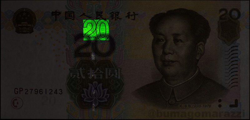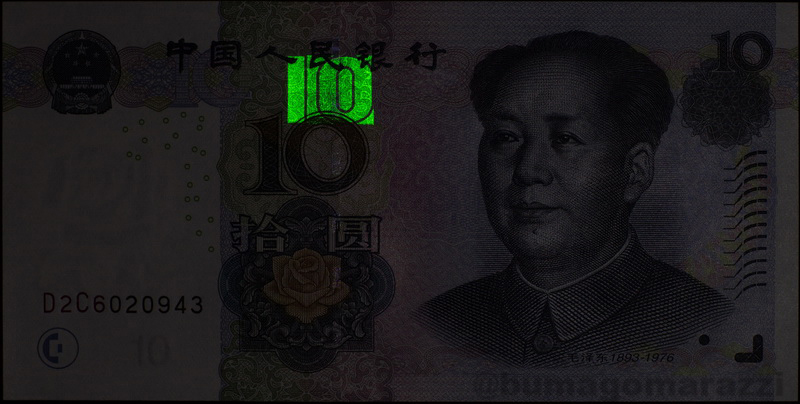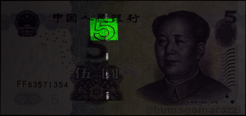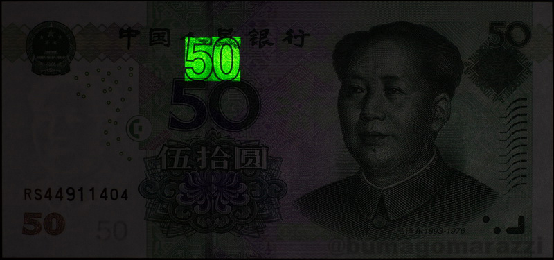 Ни доллары, ни евро не используют антистокс-защиту. А вот китайские юани (которые жэньминьби) - используют, причем тоже достаточно длительное время - начиная с серии 1999 года (P895-P901) на банкноту каждого номинала нанесен этот самый номинал антистоксовым люминофором. И после первой модификации (P903-P907), и после легкого фейслифтинга периода 2015-2020 (P909, Pnew) антистокс-метка остается на своем месте.