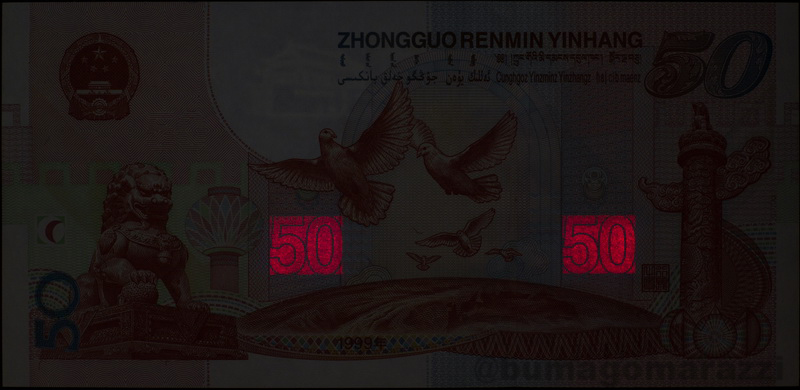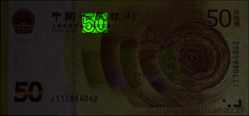 Памятные выпуски тоже не были забыты. На 50 юанях 1999 года (P891) присутствуют две метки красного цвета - интенсивность их свечения гораздо ниже "обычного" зеленого. К сожалению, нет возможности проверить полимерный китайский Миллениум - было бы интересно найти хотя бы одну полимерную банкноту с антистокс-метками. "Олимпийские" жэньминьби тоже не удалось сфотографировать.