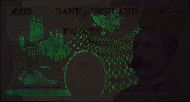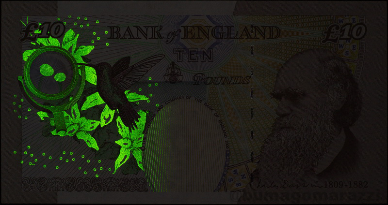 Красивейшие узоры, нанесенные антистоксовым люминофором были обнаружены на банкнотах Банка Англии серии 1999-2002 годов (P391, P389, P390) - это не просто розетки-номиналы, их художественный уровень радует глаз и тревожит сердце (шутка). В данном случае различия оттенков зеленого на самом деле имеют место, это не ошибка с цветом у фотоаппарата, причем десятка "сияет" гораздо интенсивнее остальных.